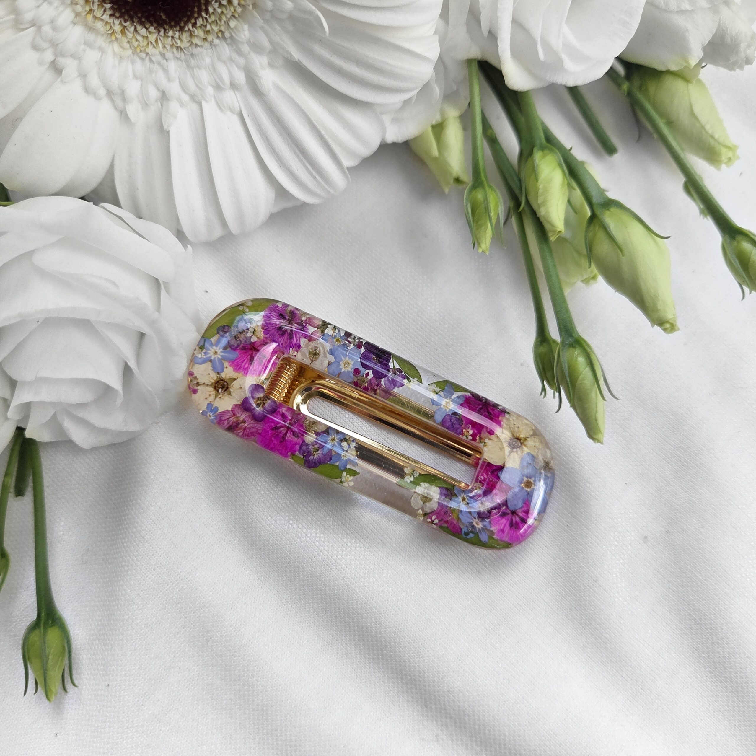 Biżuteria z kwiatami zatopionymi w żywicy budzi skojarzenia z trwałością i ponadczasowością. Przezroczysta warstwa chroni delikatne płatki, tworząc wrażenie detalu zatrzymanego w czasie, który naturalnie przyciąga uwagę i staje się sercem każdej kompozycji.