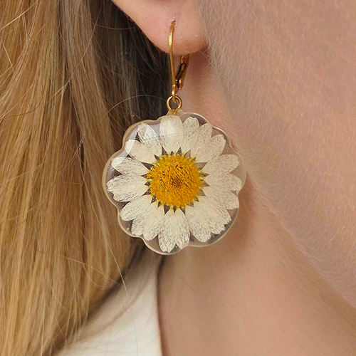 Kolczyki z kwiatami w żywicy wnoszą lekkość i delikatny ruch. Niewielkie, roślinne detale zachowane w lekkiej formie subtelnie uzupełniają całość, podkreślając spójność i harmonijny charakter kolekcji.