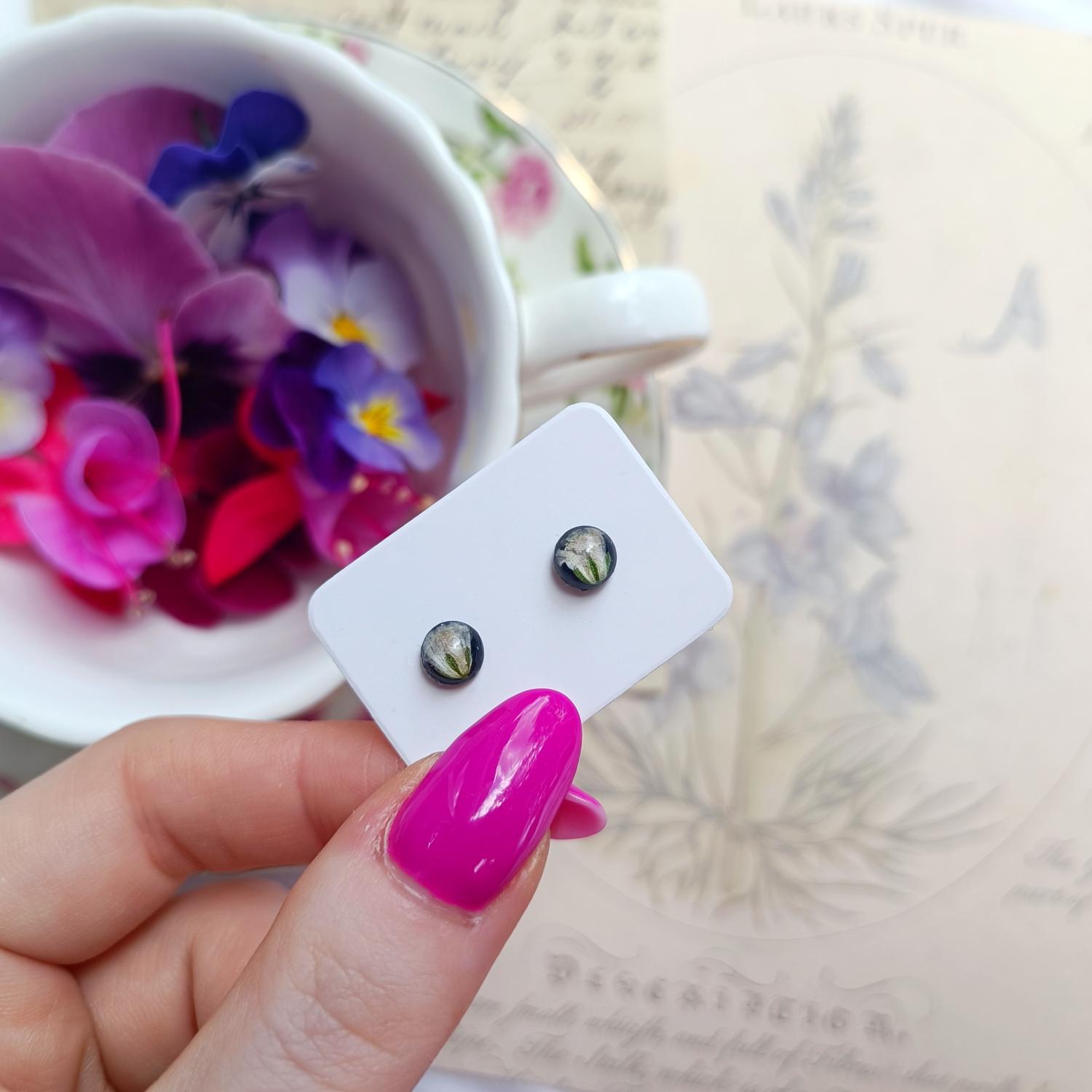 Kolczyki sztyfty z jasnym kwiatem na czarnym tle. Wyjątkowa biżuteria rękodzielnicza.