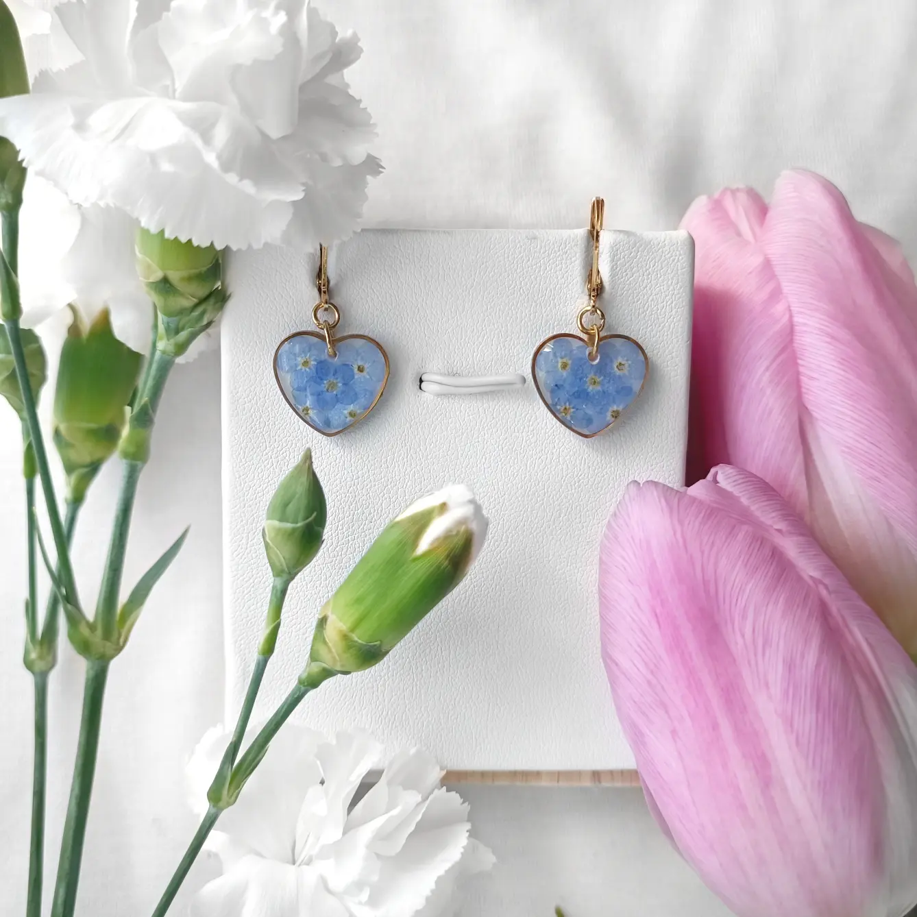 Biżuteria wykonana jest z żywicy epoksydowej polskiego producenta Modelarnia24, własnoręcznie zasuszonych kwiatów oraz wykończona elementami ze stali chirurgicznej (304 i 316L).