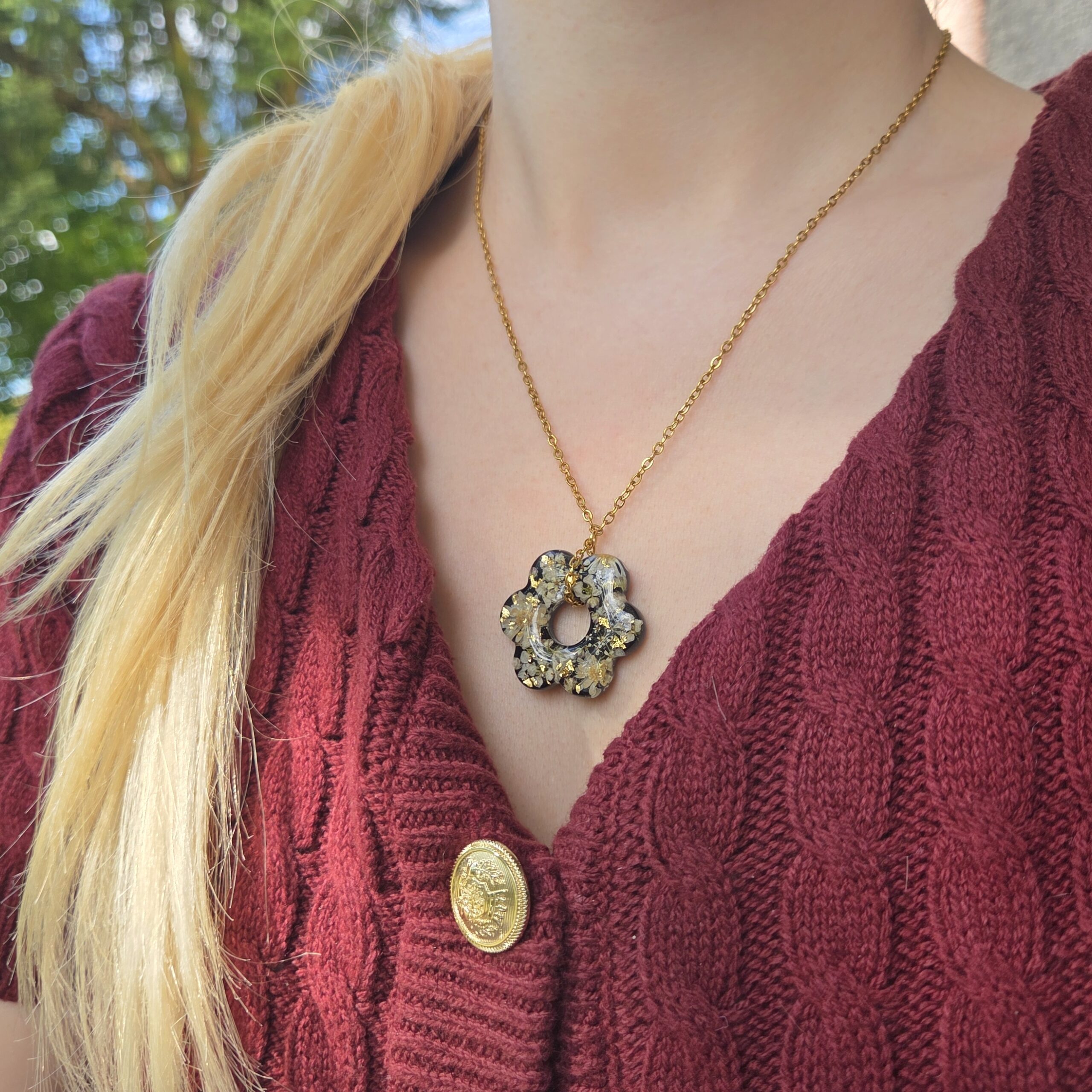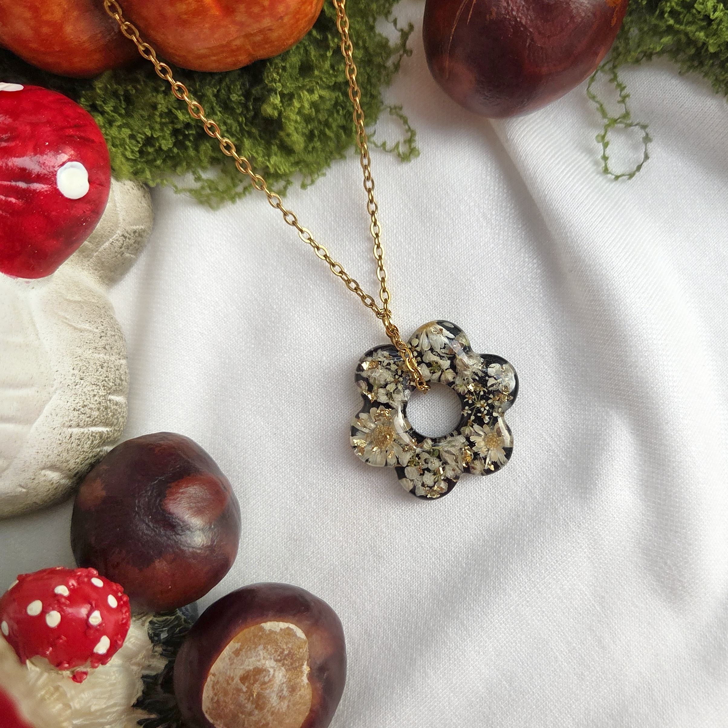 Naszyjnik w kształcie kwiatka z kompozycją roślinną, oprawiony stalą chirurgiczną.