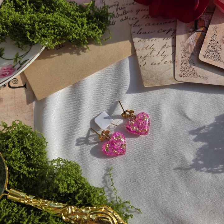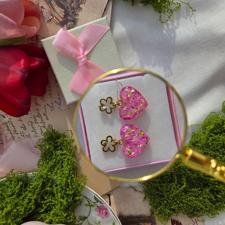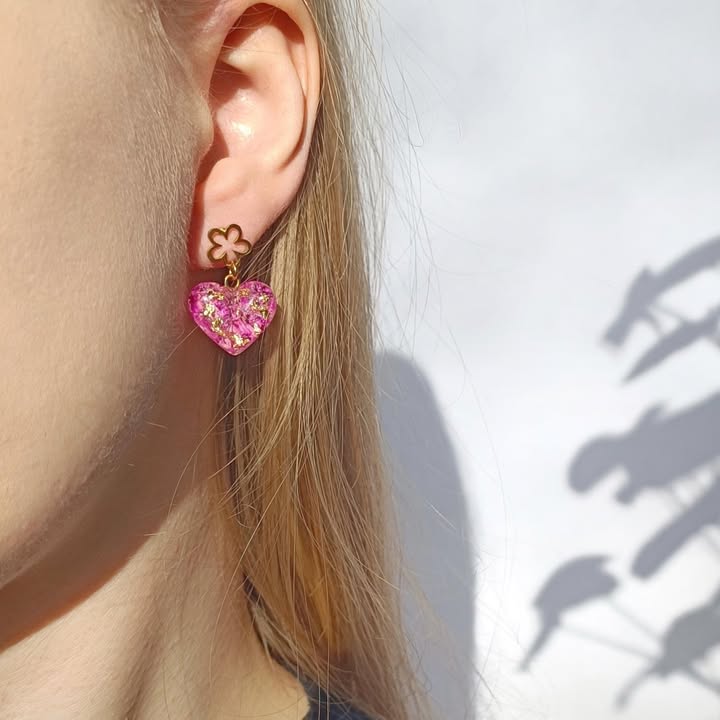 Różowe kolczyki serduszka z żywicy epoksydowej i płatków gipsówki. Luksusowy i romantyczny prezent dla każdej kobiety. Unikatowe rękodzieło.