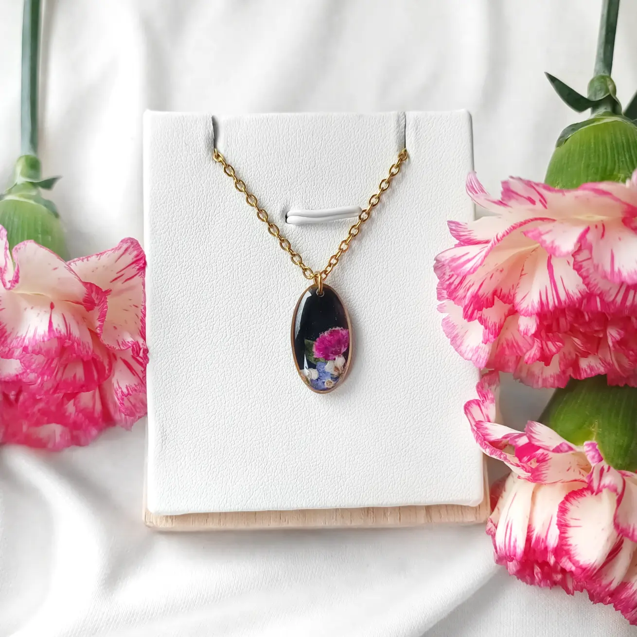 Biżuteria wykonana jest z żywicy epoksydowej polskiego producenta Modelarnia24, własnoręcznie zasuszonych kwiatów oraz wykończona elementami ze stali chirurgicznej (304 i 316L).