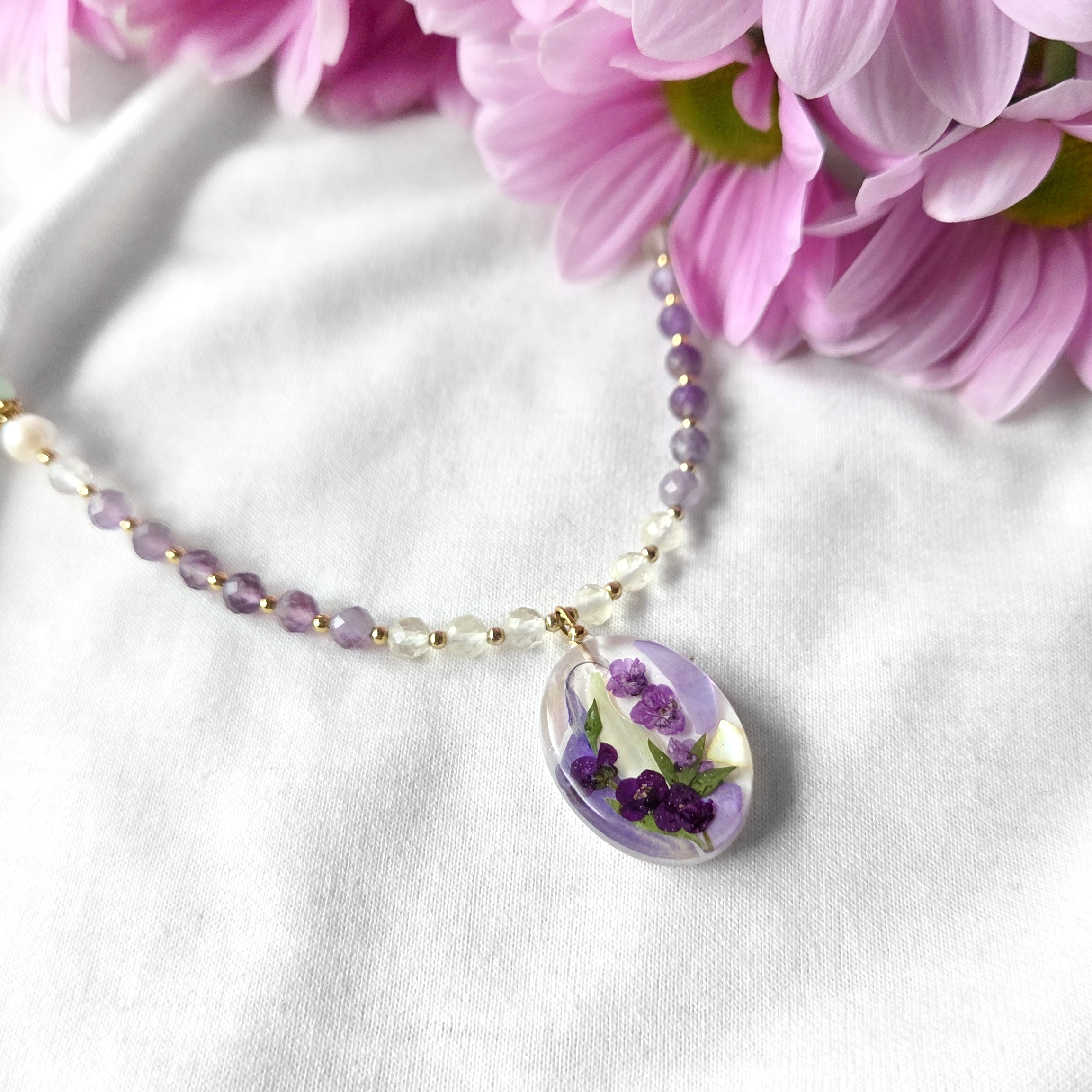 Wielokwiatowa kompozycja w naszyjniku z żywicy epoksydowej. Rękodzieło najwyższej jakości. Wiosenny naszyjnik.