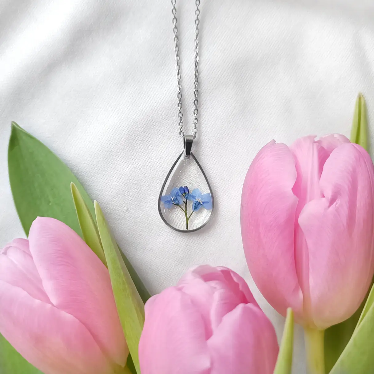 Biżuteria wykonana jest z żywicy epoksydowej polskiego producenta Modelarnia24, własnoręcznie zasuszonych kwiatów oraz wykończona elementami ze stali chirurgicznej (304 i 316L).