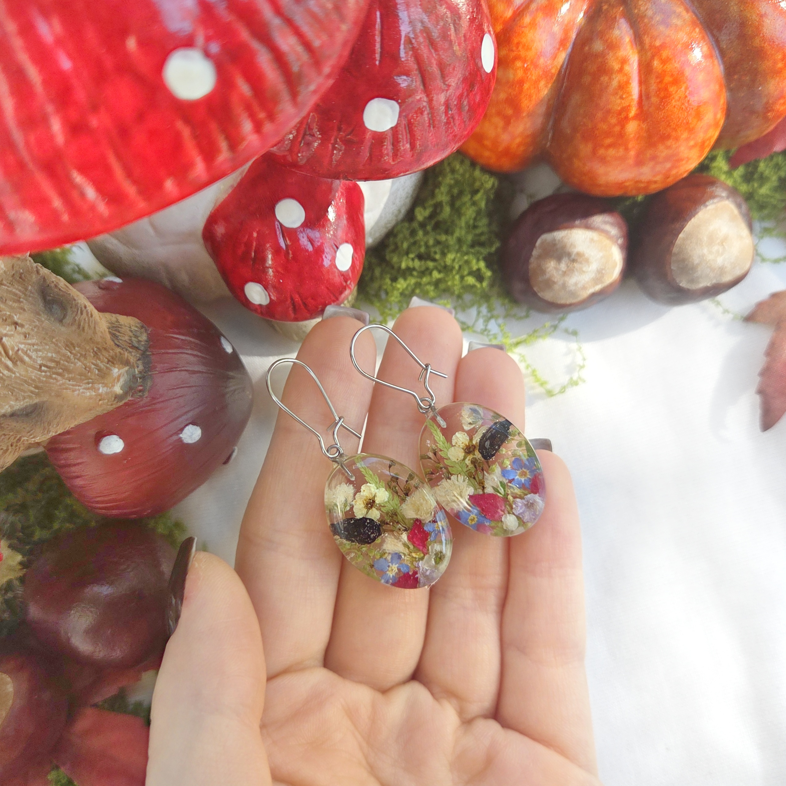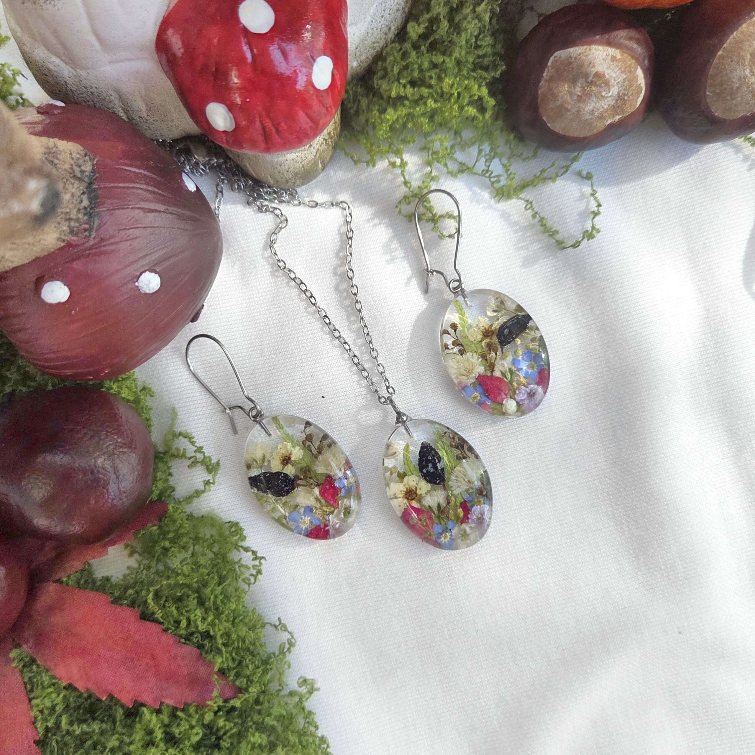 Owalny komplet biżuterii z żywicy epoksydowej z suszonymi kwiatami. Biżuteria handmade inspirowana natura.
