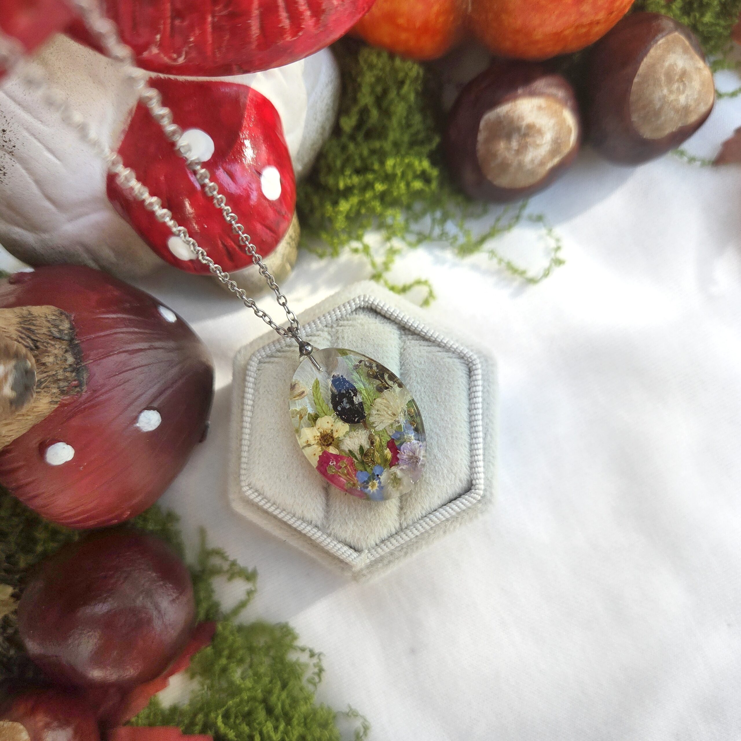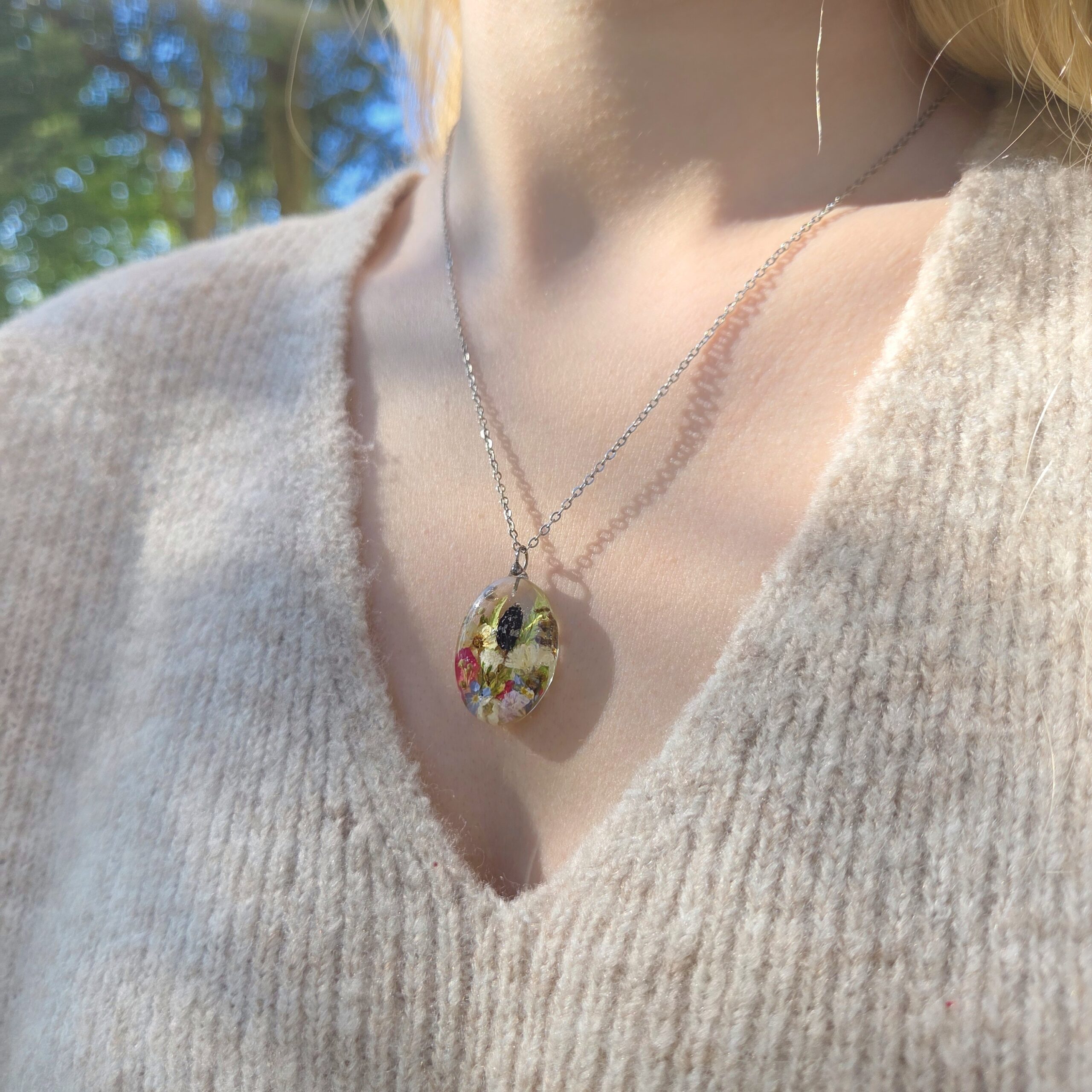 Biżuteria wykonana jest z żywicy epoksydowej polskiego producenta Modelarnia24, własnoręcznie zasuszonych kwiatów oraz wykończona elementami ze stali chirurgicznej (304 i 316L).