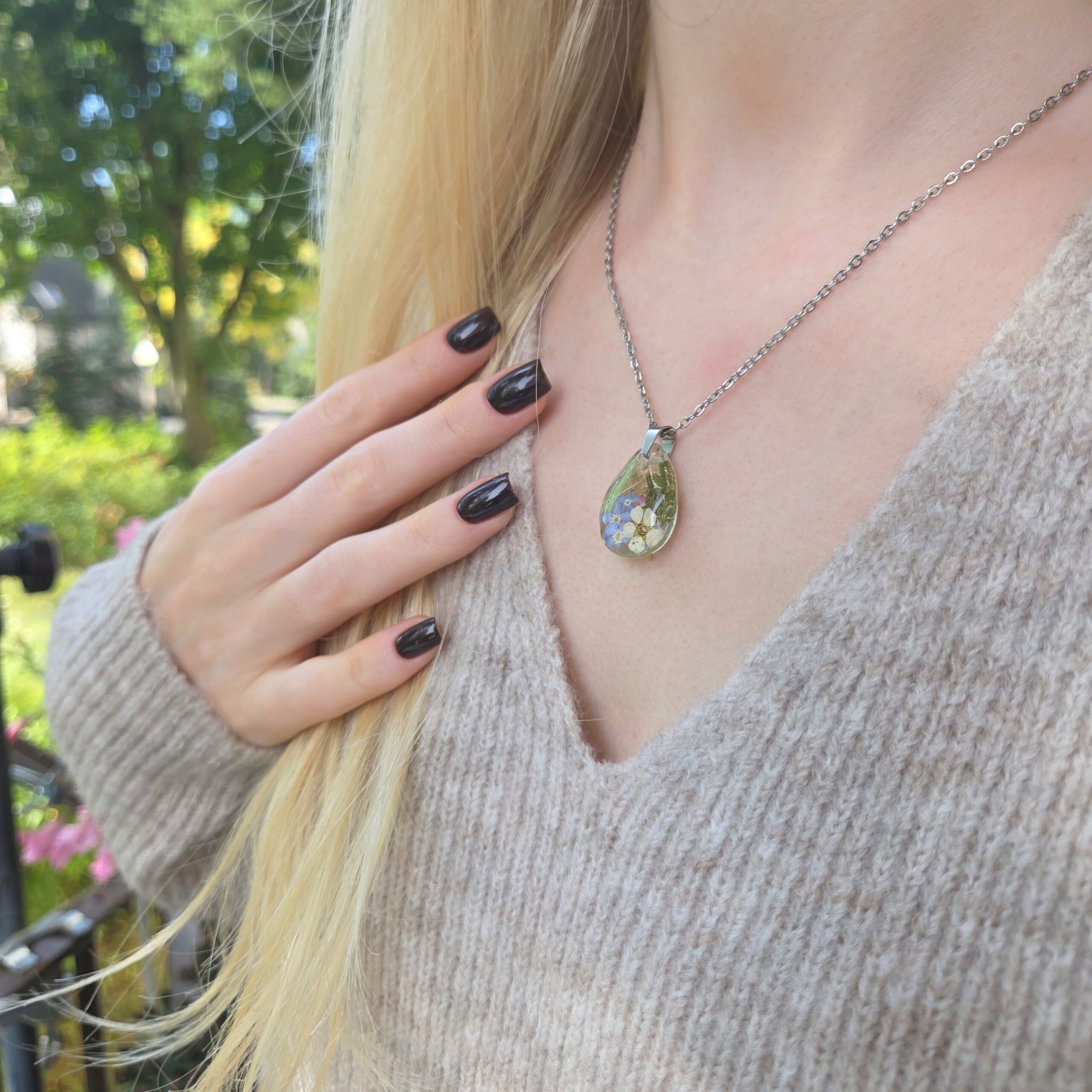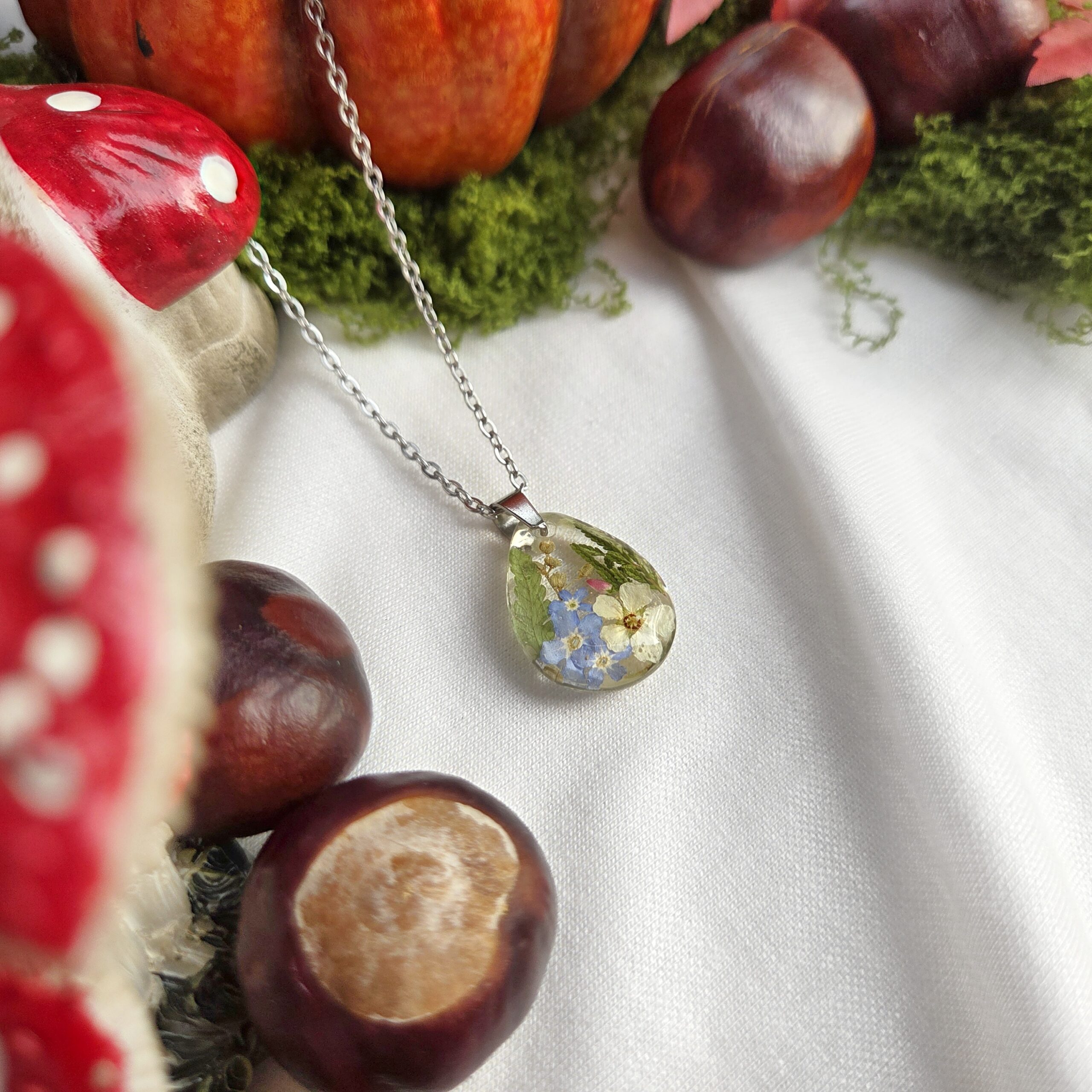 Biżuteria wykonana jest z żywicy epoksydowej polskiego producenta Modelarnia24, własnoręcznie zasuszonych kwiatów oraz wykończona elementami ze stali chirurgicznej (304 i 316L).