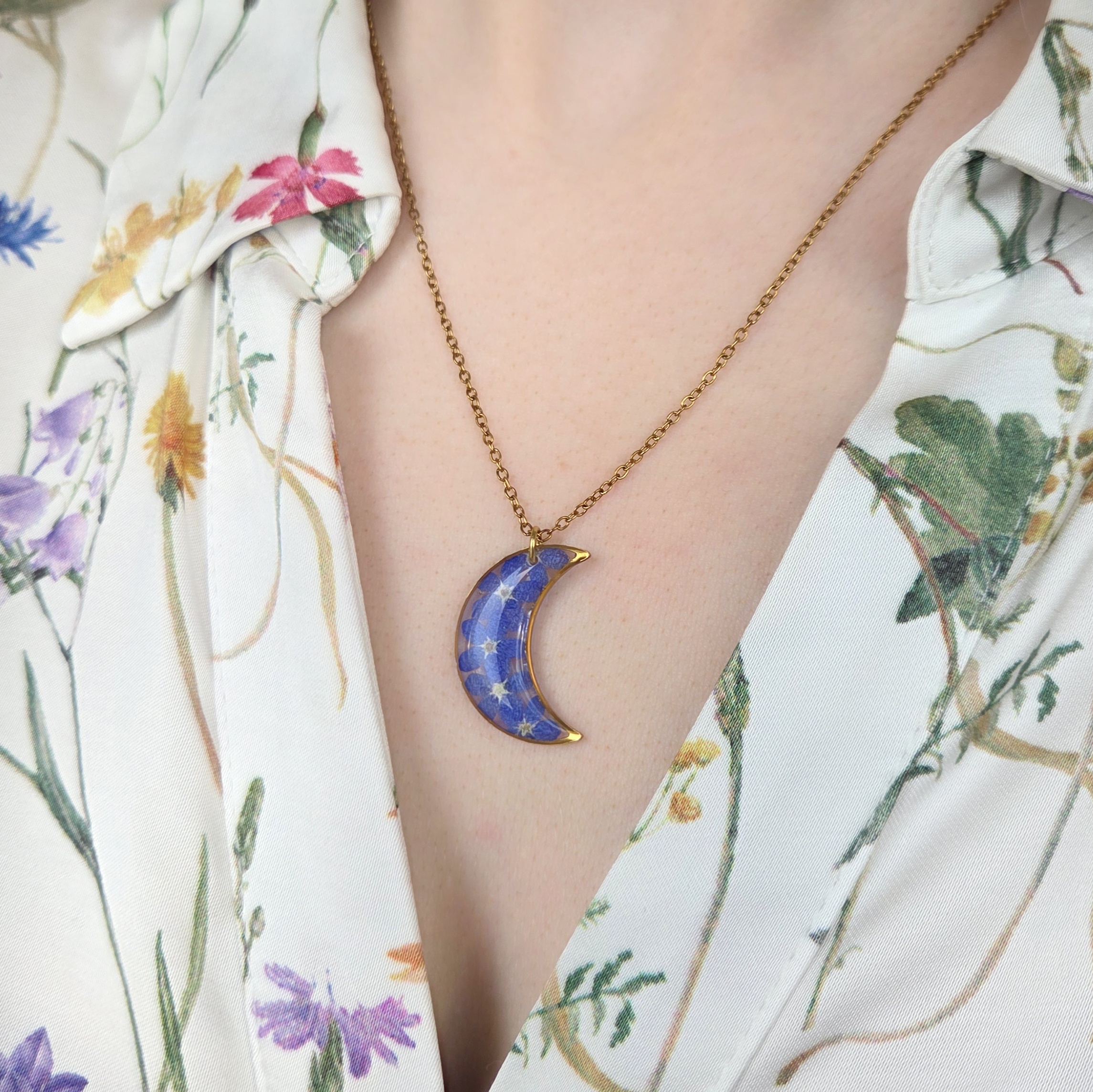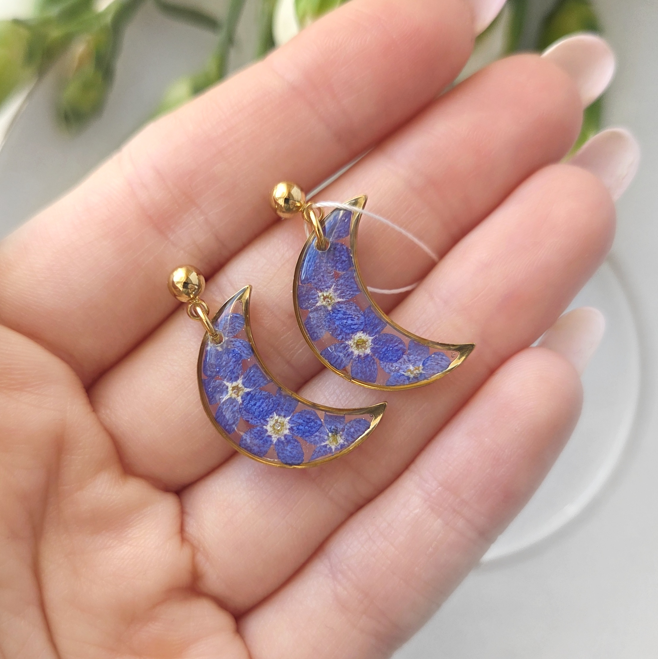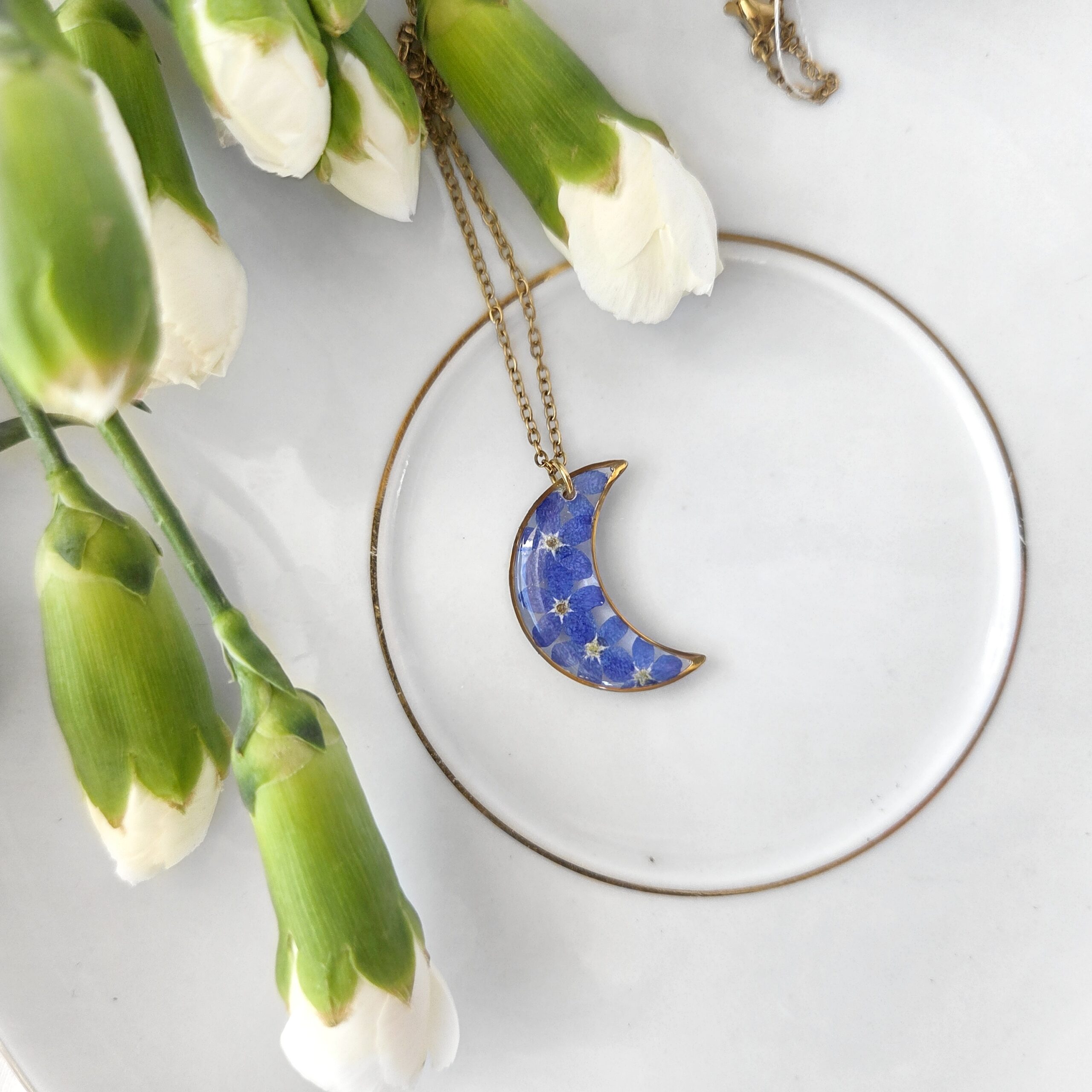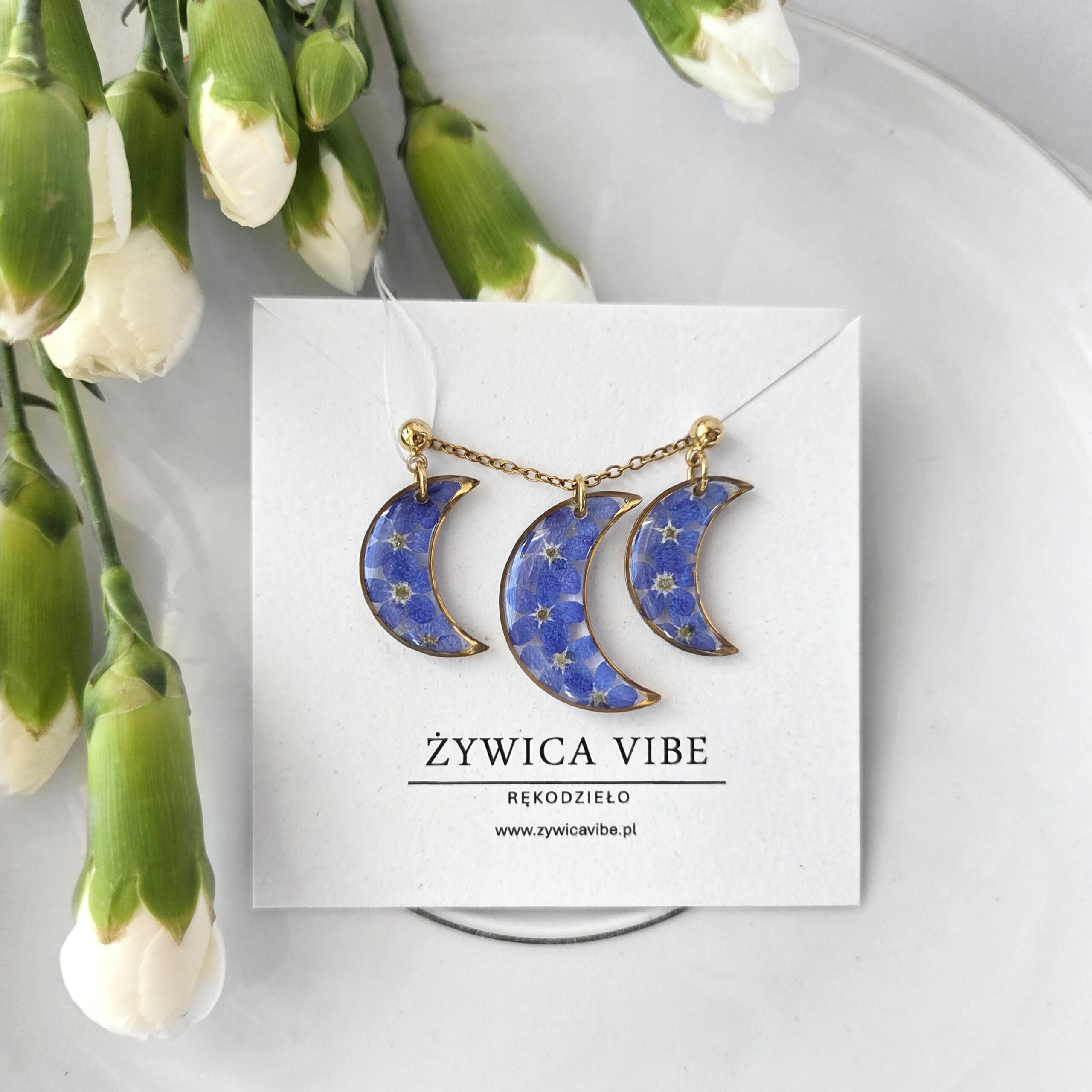 Komplet biżuterii w kształcie księżyca z niezapominajkami w żywicy epoksydowej. Unikatowe rękodzieło.