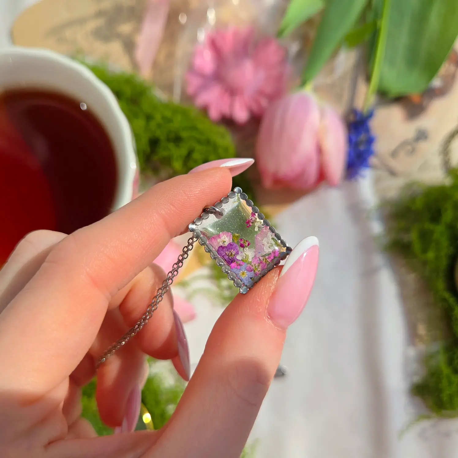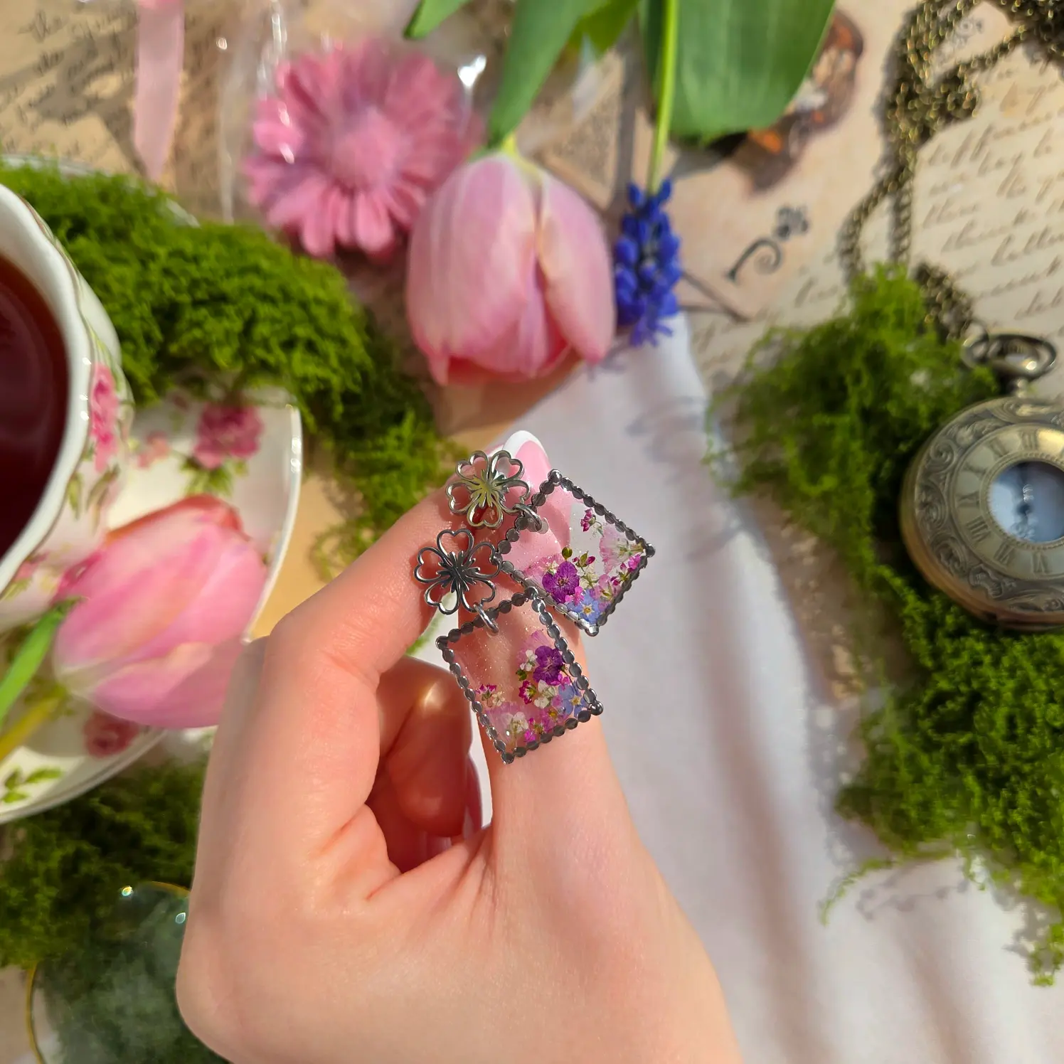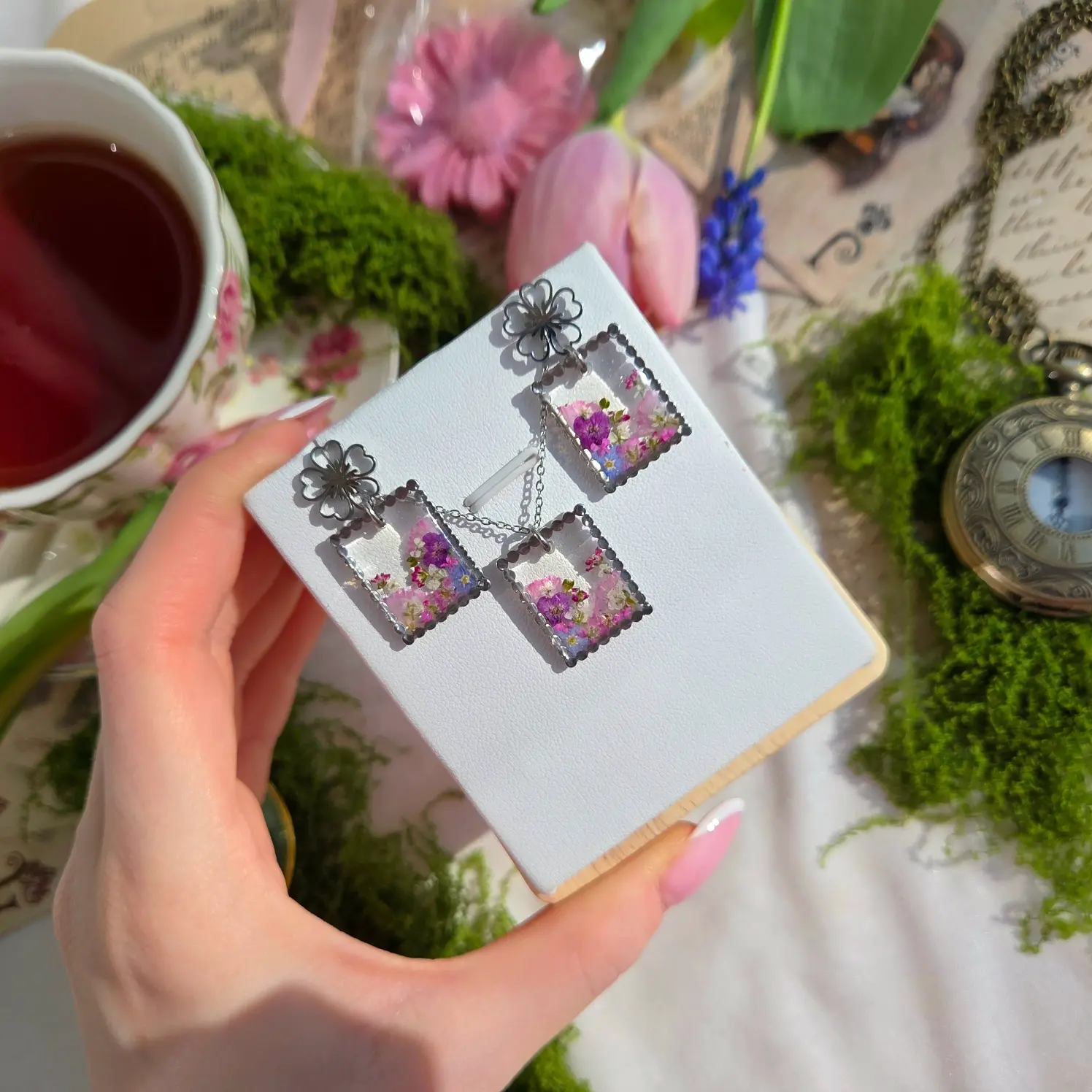 Biżuteria wykonana jest z żywicy epoksydowej polskiego producenta Modelarnia24, własnoręcznie zasuszonych kwiatów oraz wykończona elementami ze stali chirurgicznej (304 i 316L).