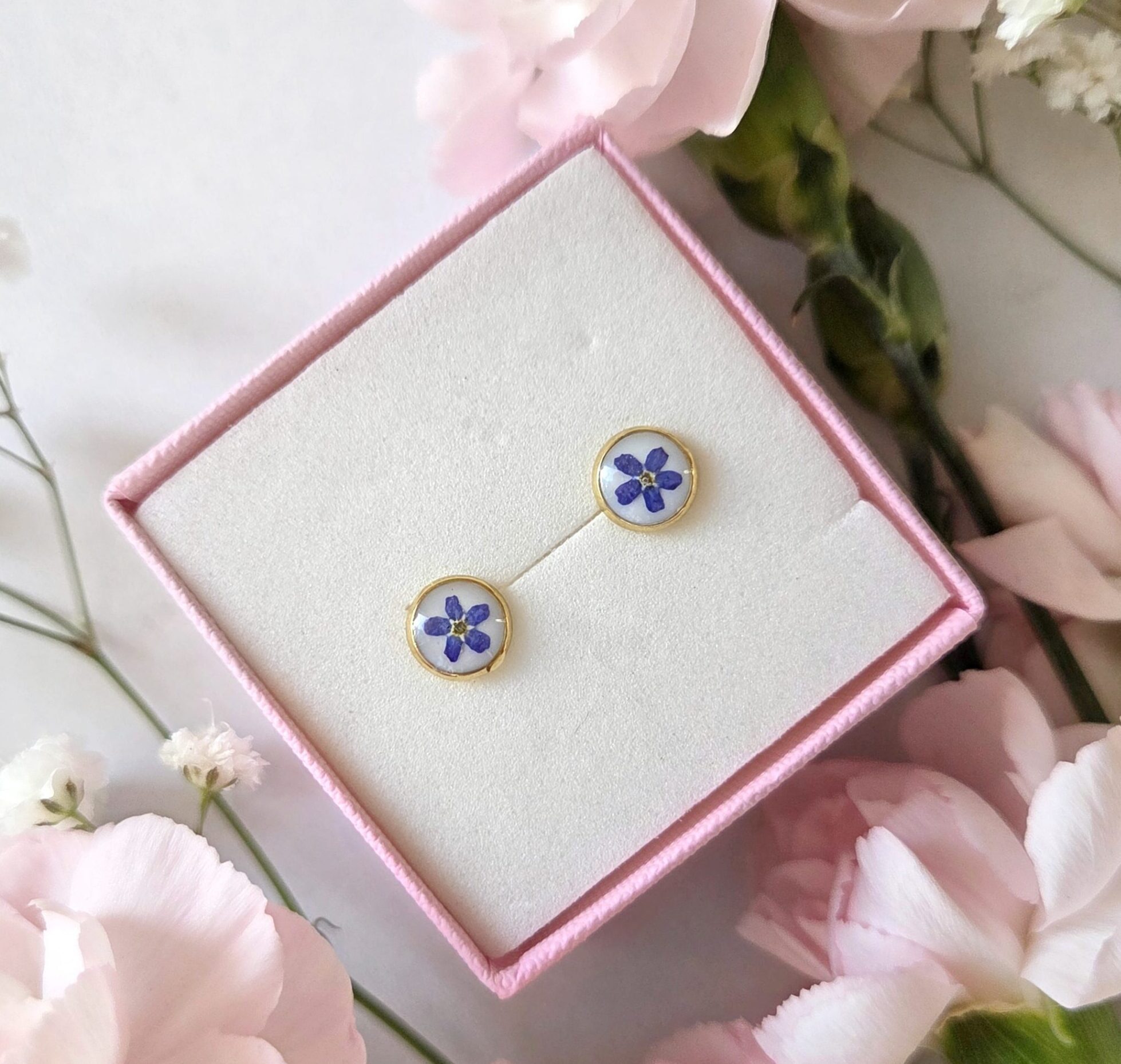 Kolczyki sztyfty z niezapominajkami zatopionymi w żywicy epoksydowej. Prawdziwe suszone kwiaty w biżuterii. Kolczyki w stali chirurgicznej.