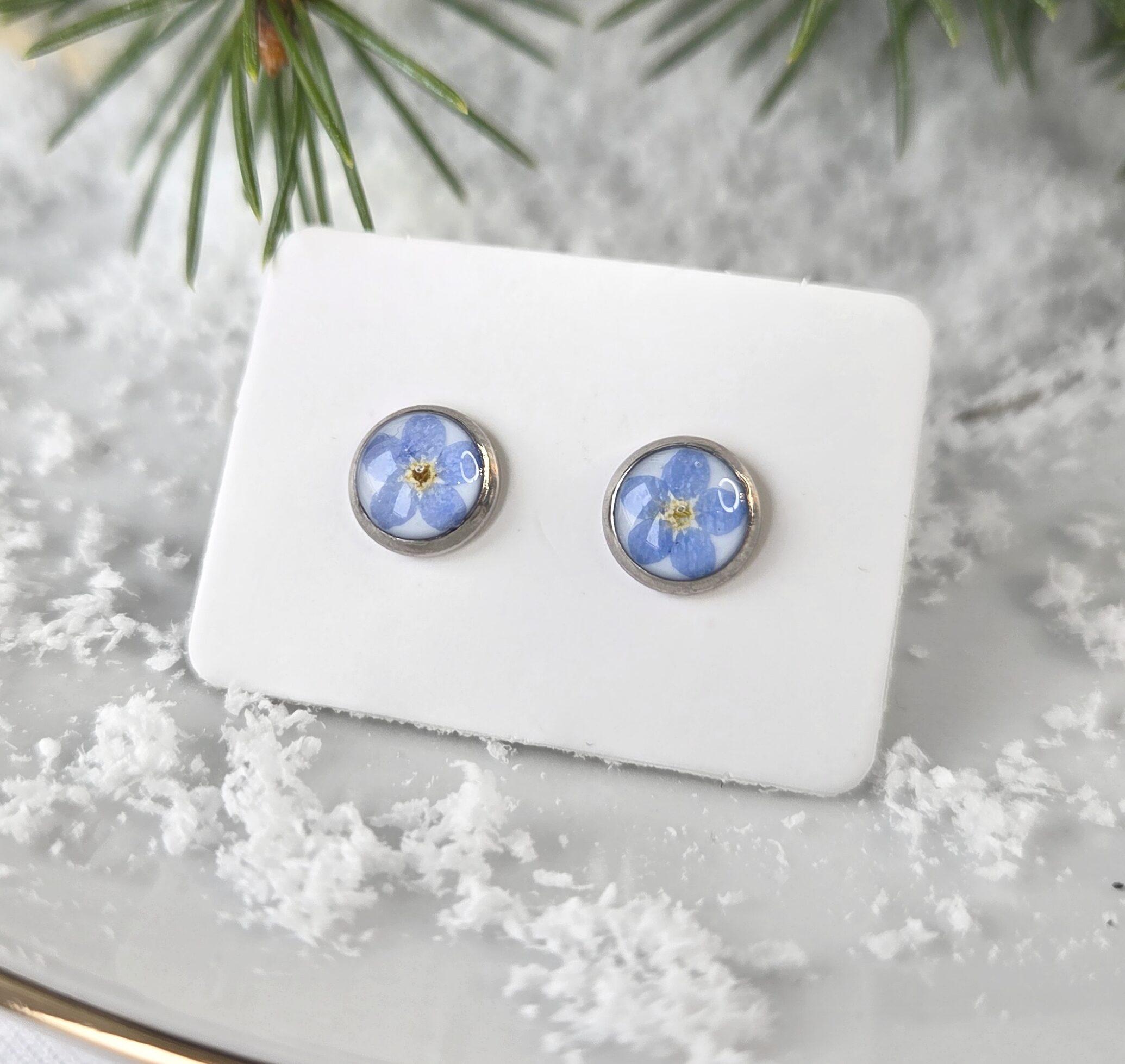 Malutkie kolczyki wkrętki z niezapominajkami. Prawdziwe kwiaty, niezapominajki w biżuterii. Luksusowe rękodzieło dla miłośniczki natury.