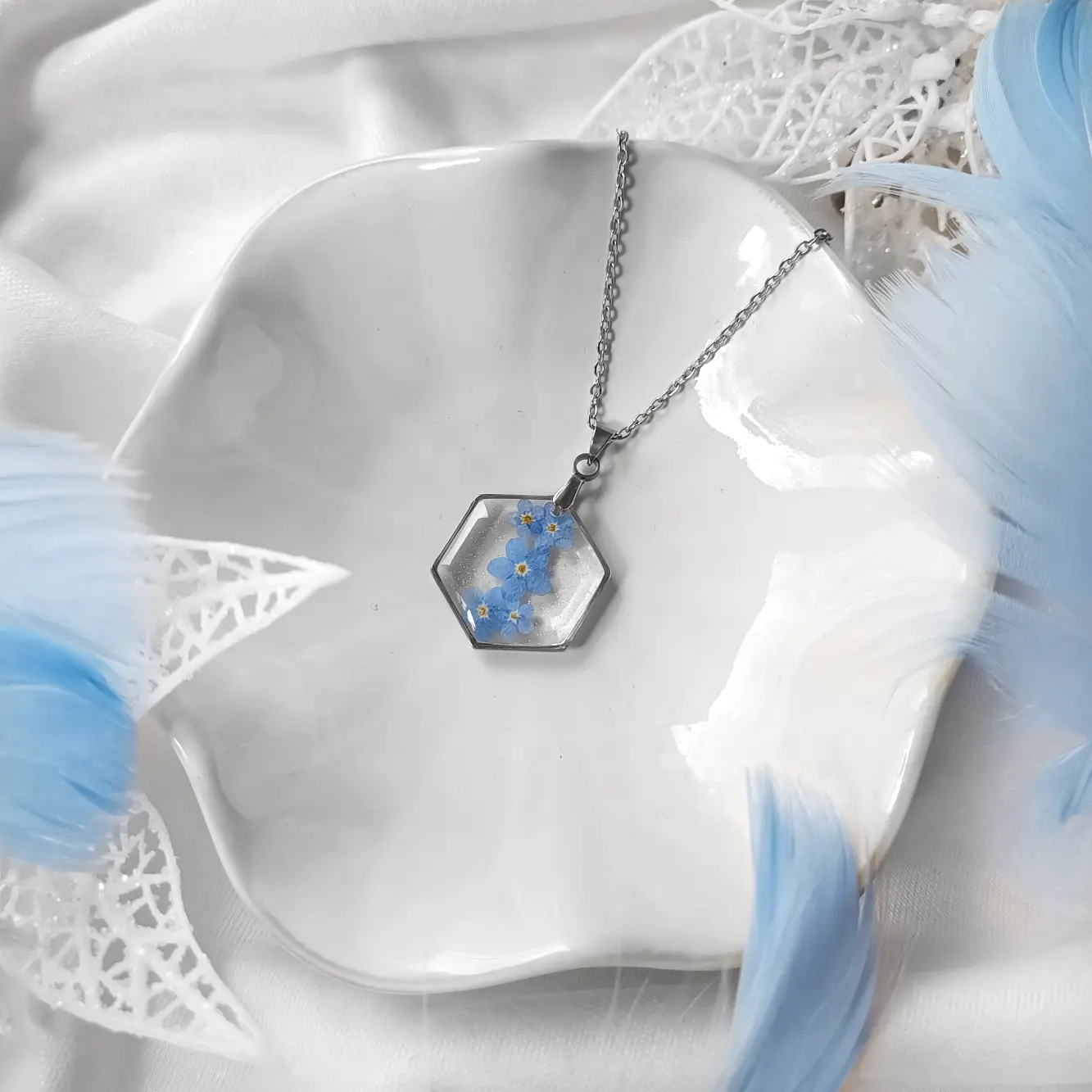 Biżuteria wykonana jest z żywicy epoksydowej polskiego producenta Modelarnia24, własnoręcznie zasuszonych kwiatów oraz wykończona elementami ze stali chirurgicznej (304 i 316L).