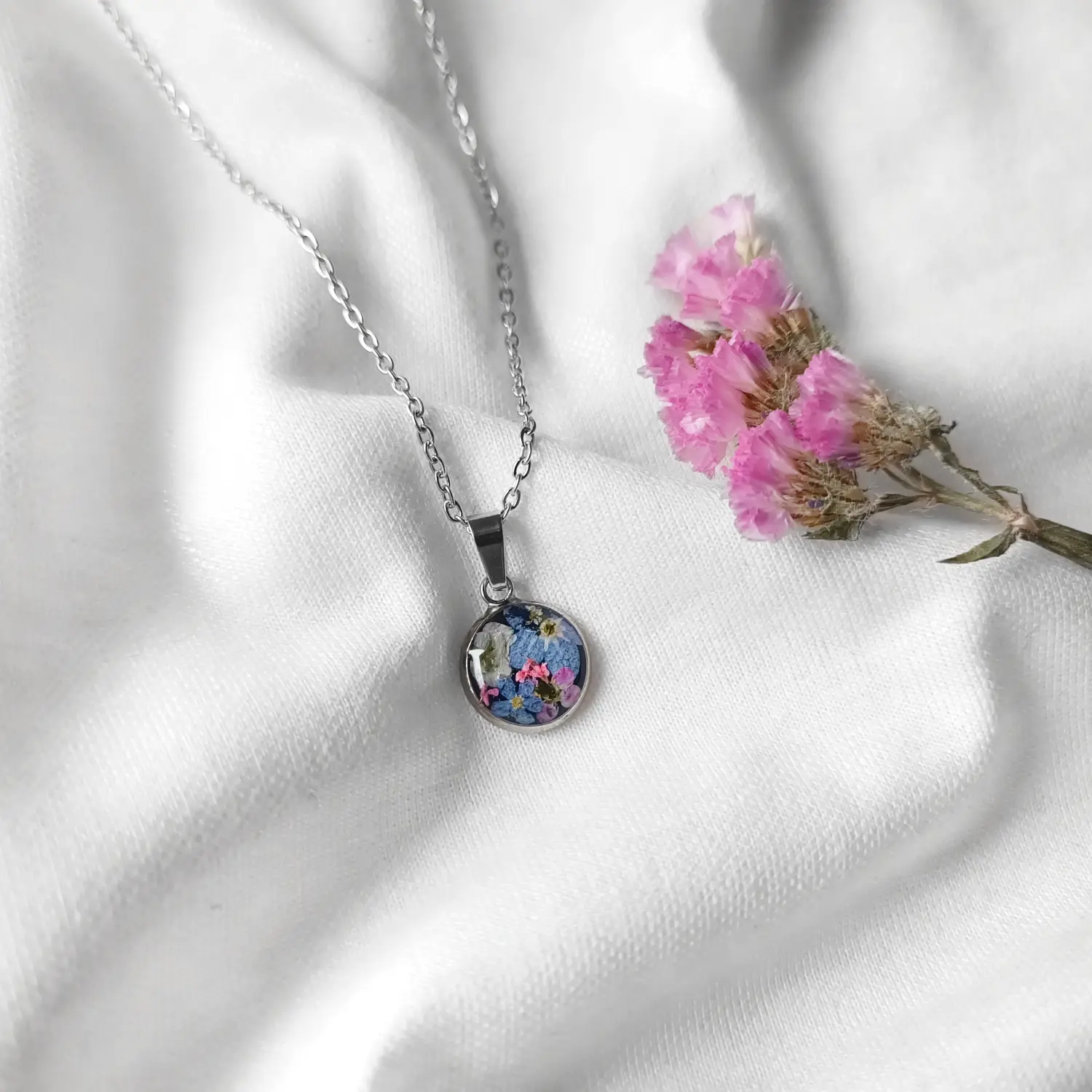 Biżuteria wykonana jest z żywicy epoksydowej polskiego producenta Modelarnia24, własnoręcznie zasuszonych kwiatów oraz wykończona elementami ze stali chirurgicznej (304 i 316L).