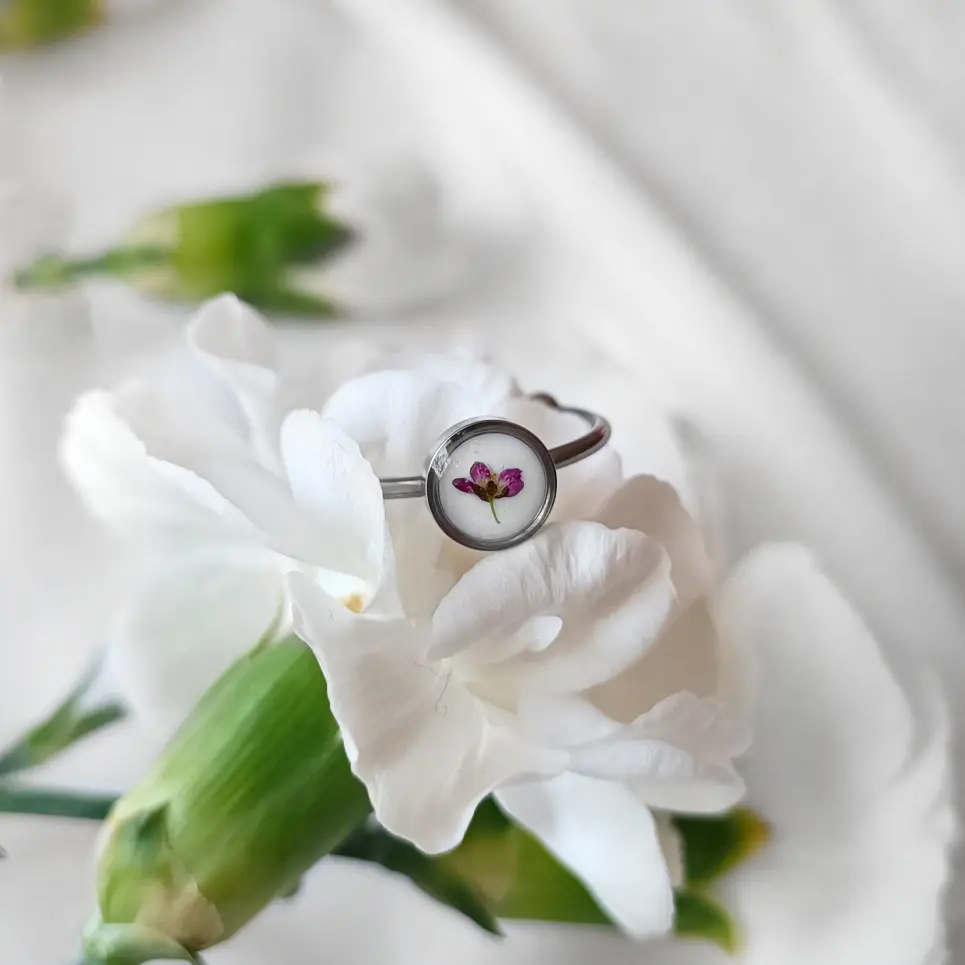 Ręcznie robiona biżuteria z żywicy z naturalnym kwiatem smagliczki. Subtelny i wyjątkowy dodatek dla miłośniczek rękodzieła.