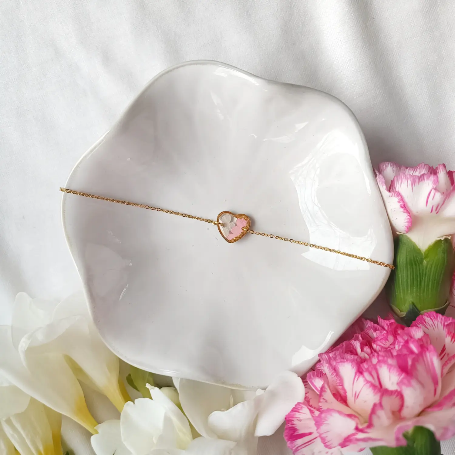 Bransoletka w kształcie serca z żywicy epoksydowej z kwiatową kompozycją. Biżuteria handmade, pełna uroku i symboliki miłości.