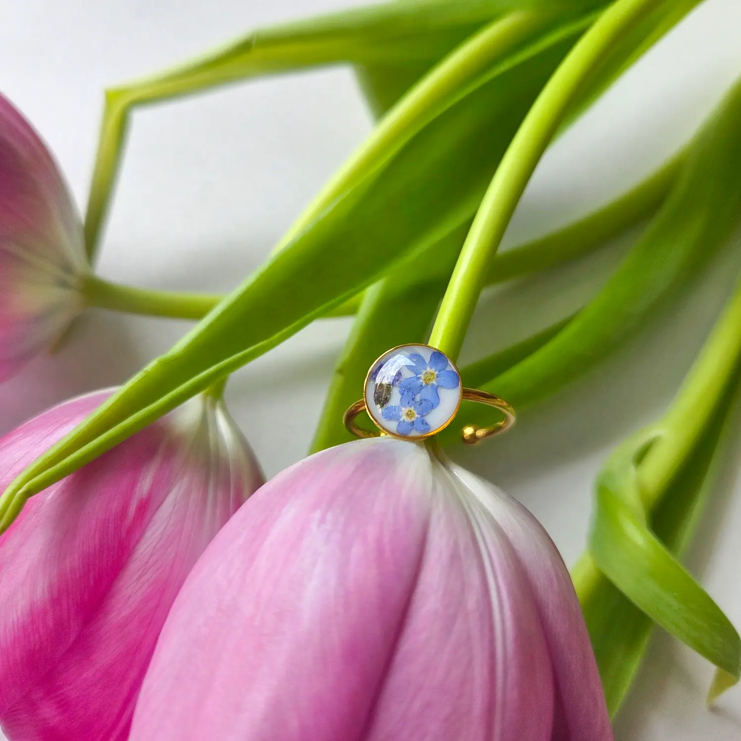 Rękodzielnicza biżuteria z żywicy epoksydowej z niezapominajkami. Handmade pierścionek ze stali chirurgicznej, pełen romantycznego uroku.