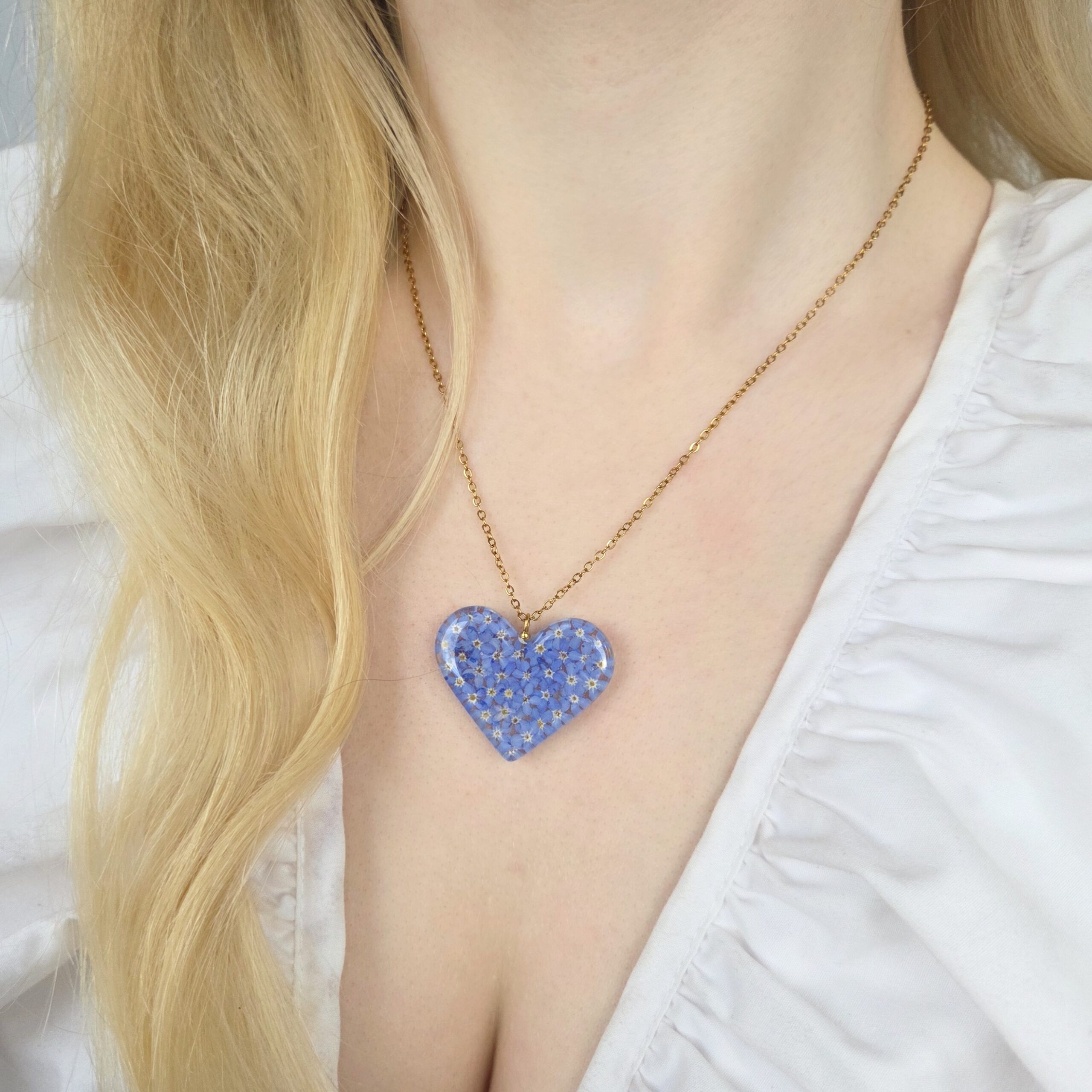 Niezapominajki w naszyjniku w kształcie serca, oprawione stalą chirurgiczną.