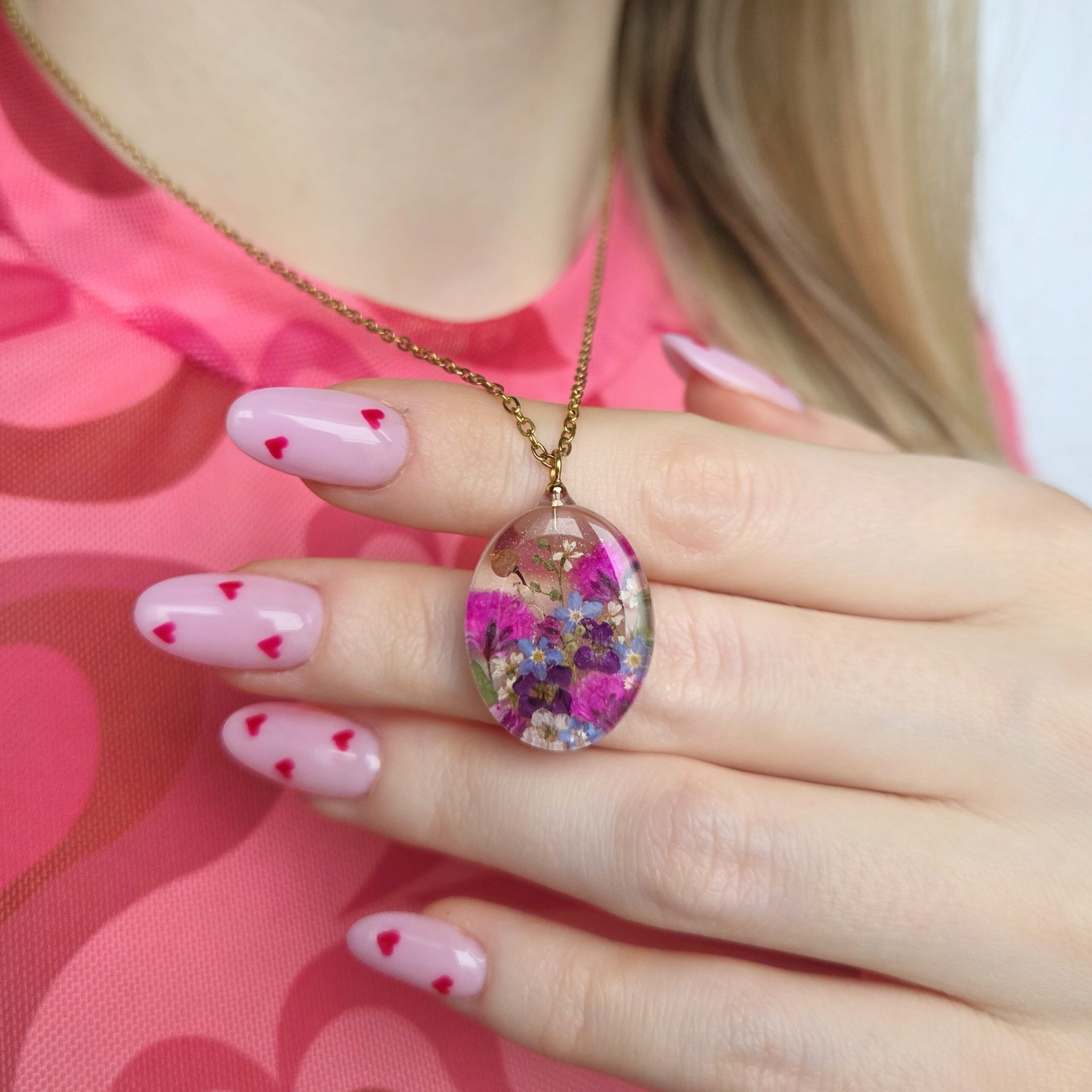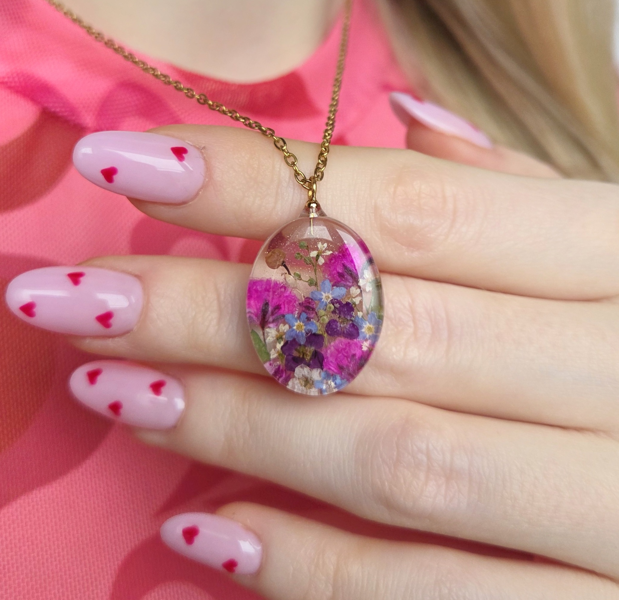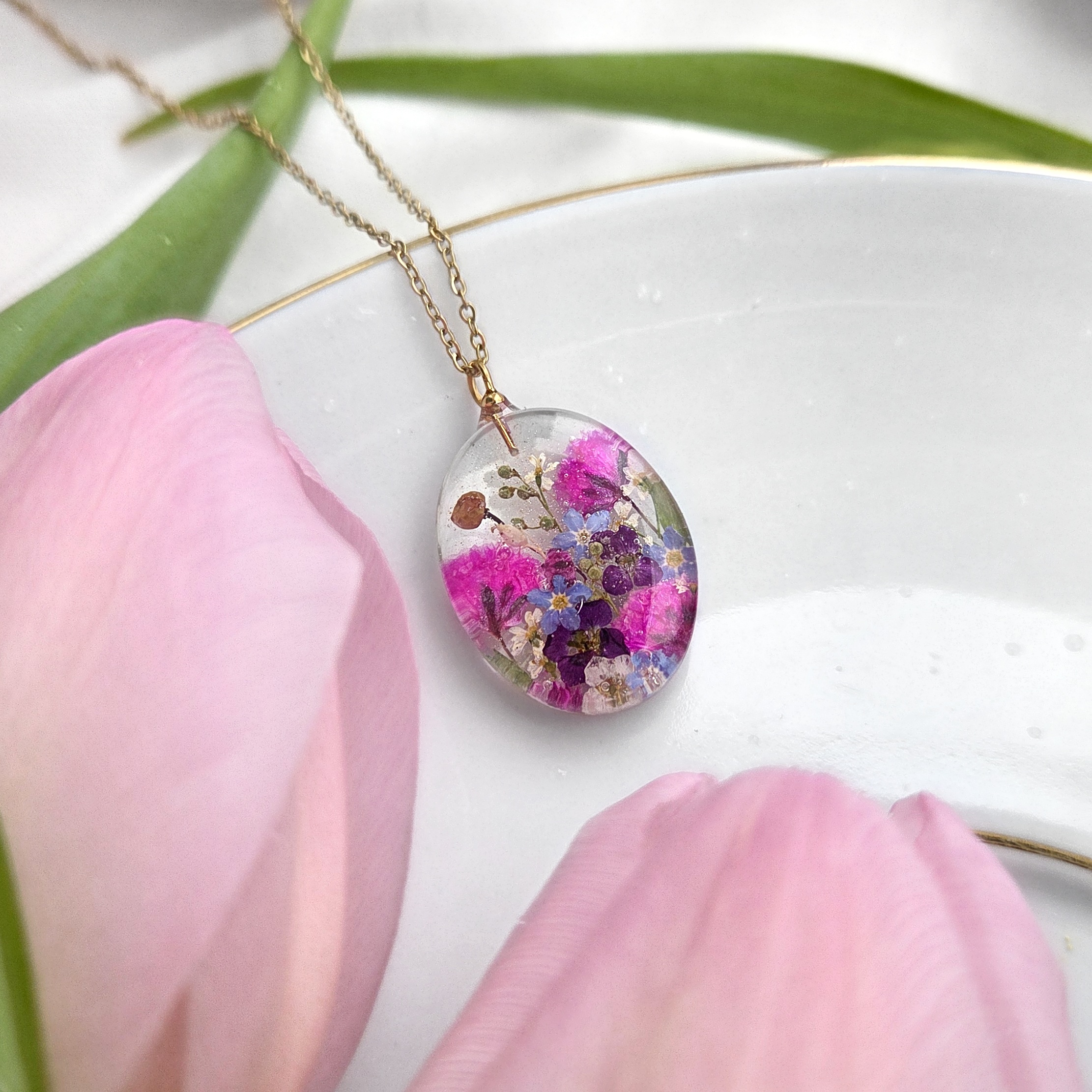 Wielokwiatowa kompozycja w naszyjniku z żywicy epoksydowej. Rękodzieło najwyższej jakości. Wiosenny naszyjnik.