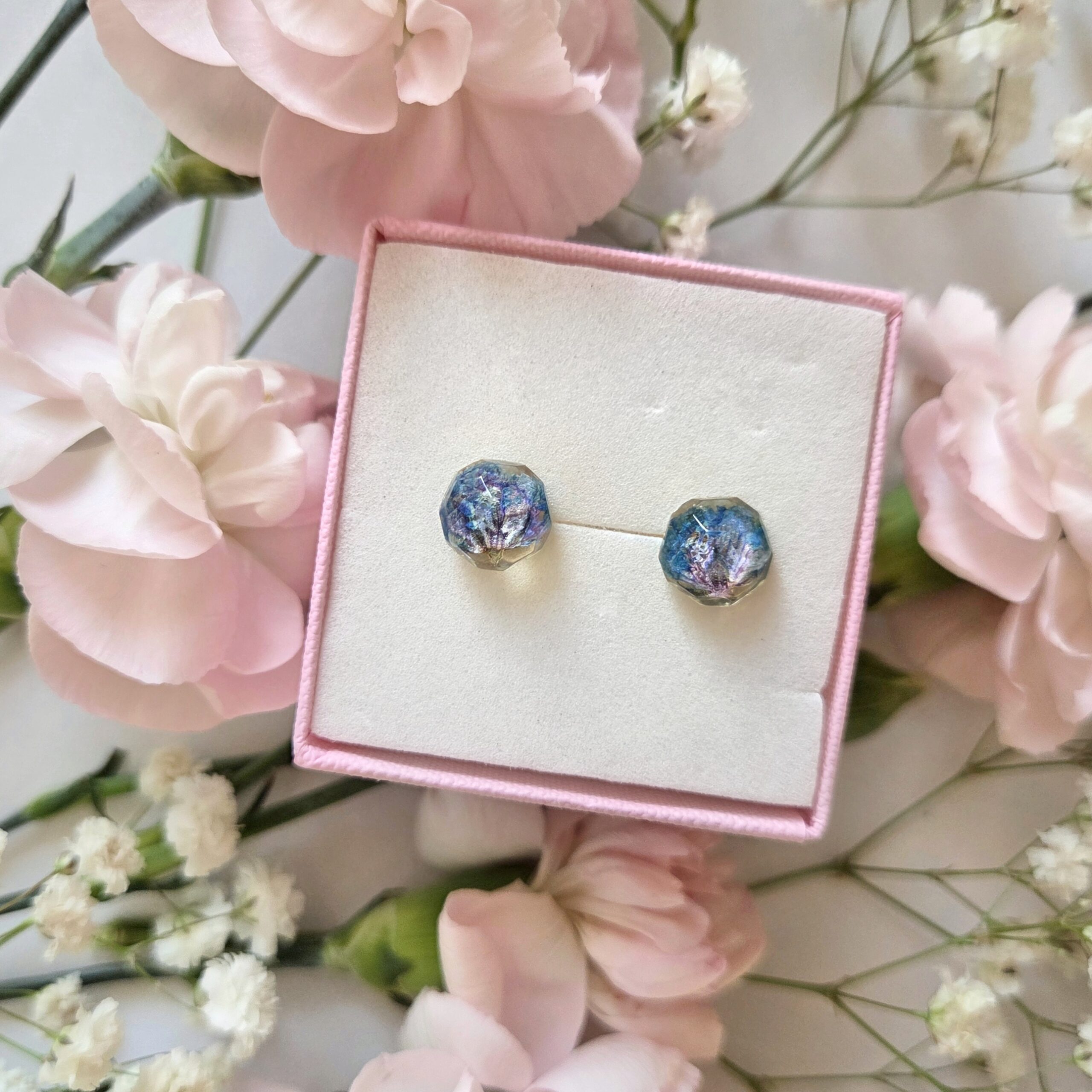 Kolczyki sztyfty półkule w turkusowym kolorze z prawdziwymi kwiatami zatopionymi w żywicy epoksydowej. Rękodzielnicza biżuteria.