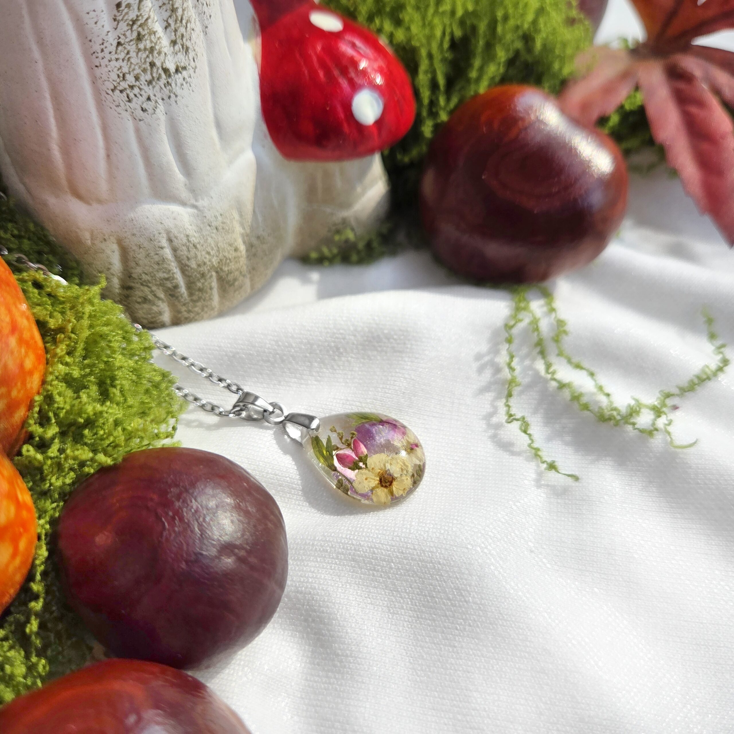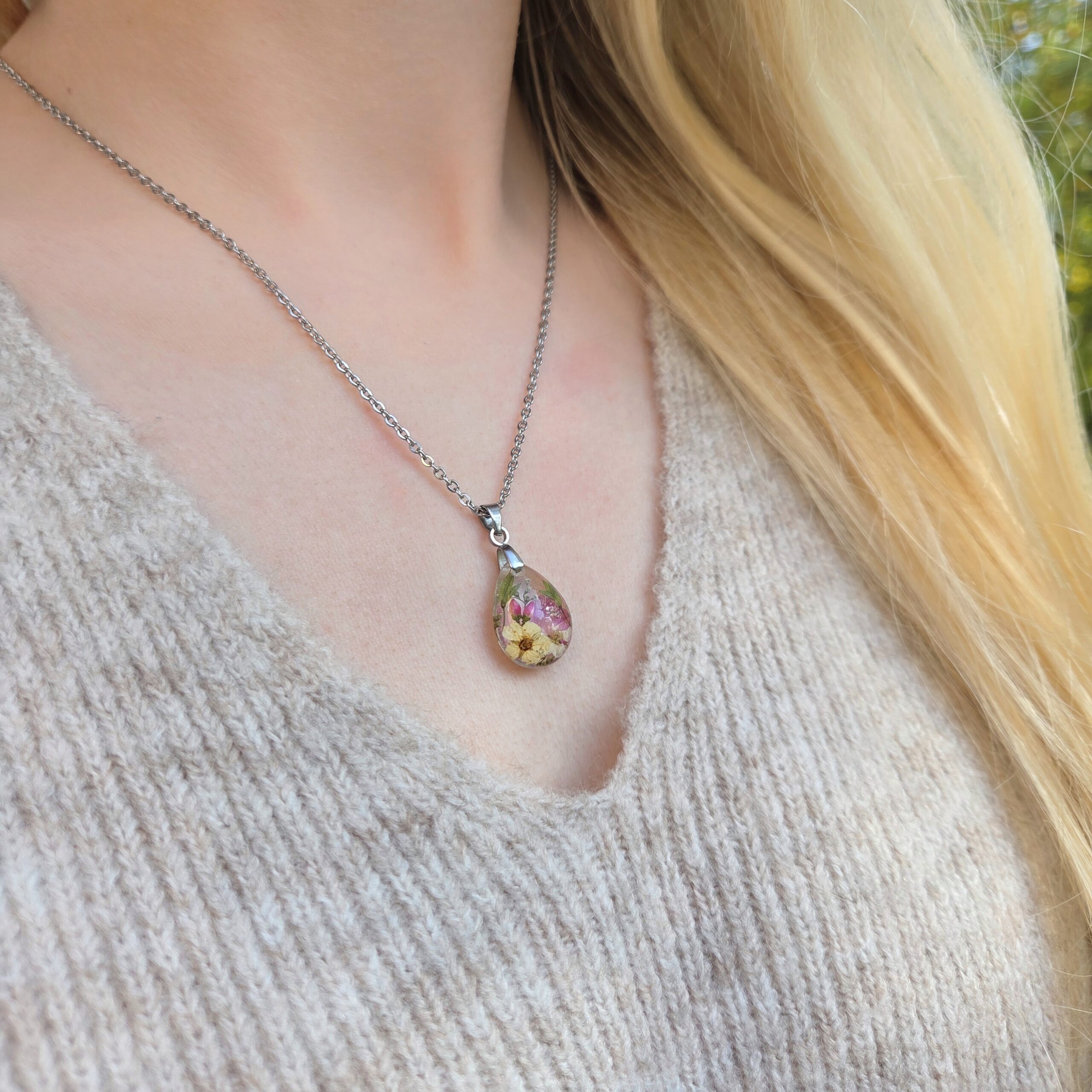 Biżuteria wykonana jest z żywicy epoksydowej polskiego producenta Modelarnia24, własnoręcznie zasuszonych kwiatów oraz wykończona elementami ze stali chirurgicznej (304 i 316L).