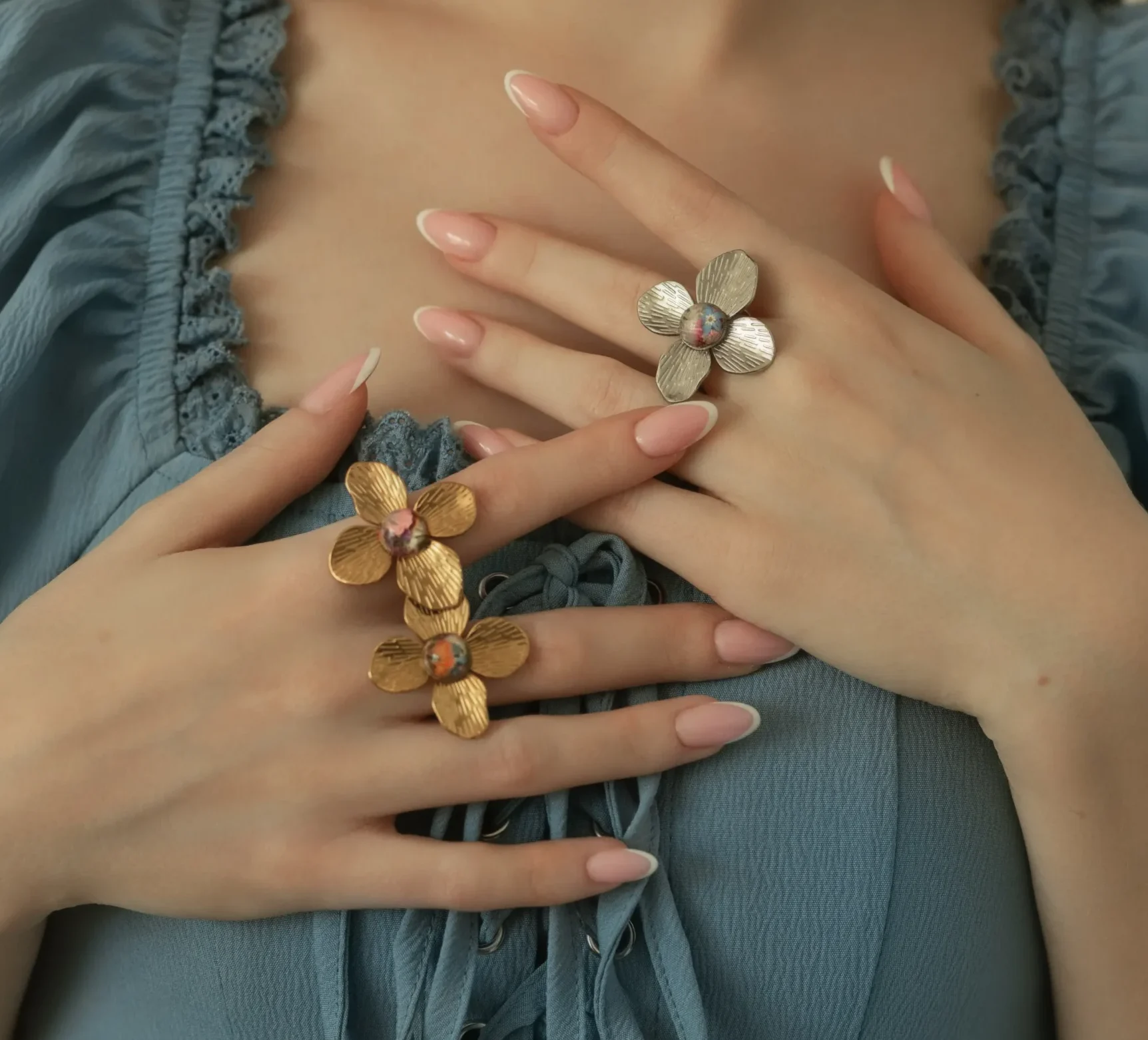 Duże pierścionki w kształcie kwiatów, oprawione stalą chirurgiczną.