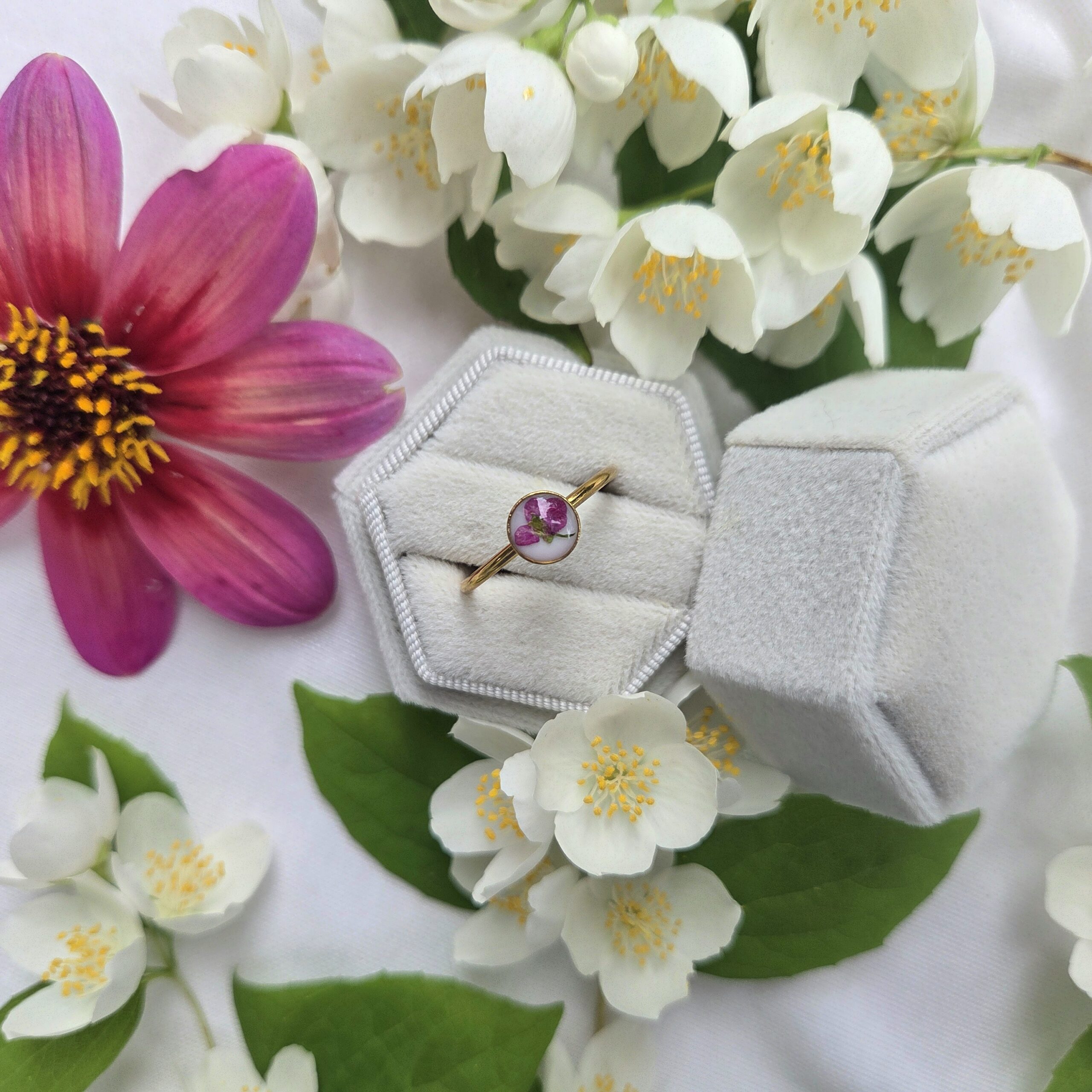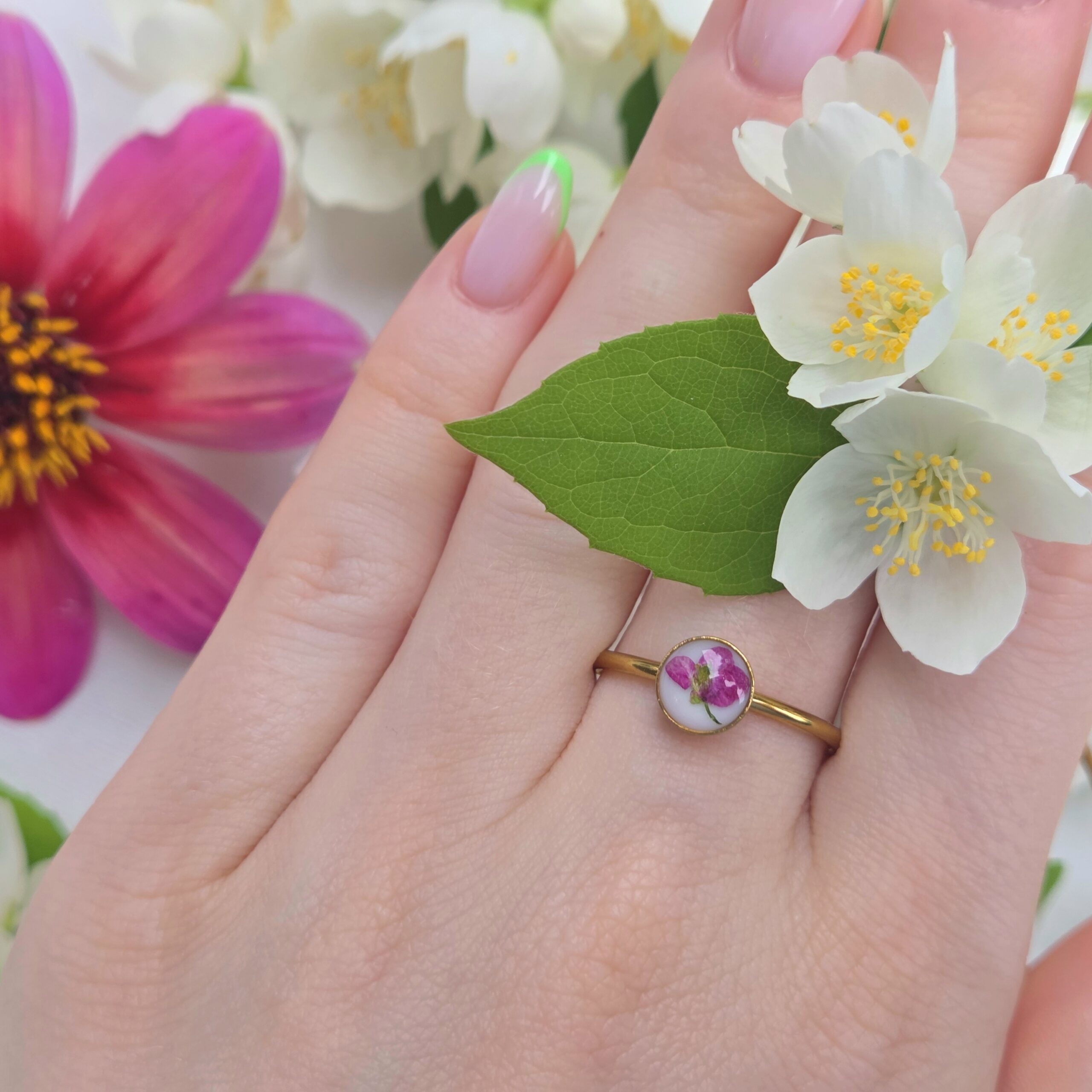 Biżuteria wykonana jest z żywicy epoksydowej polskiego producenta Modelarnia24, własnoręcznie zasuszonych kwiatów oraz wykończona elementami ze stali chirurgicznej (304 i 316L).