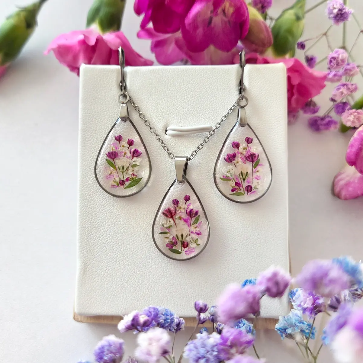 Biżuteria wykonana jest z żywicy epoksydowej polskiego producenta Modelarnia24, własnoręcznie zasuszonych kwiatów oraz wykończona elementami ze stali chirurgicznej (304 i 316L).
