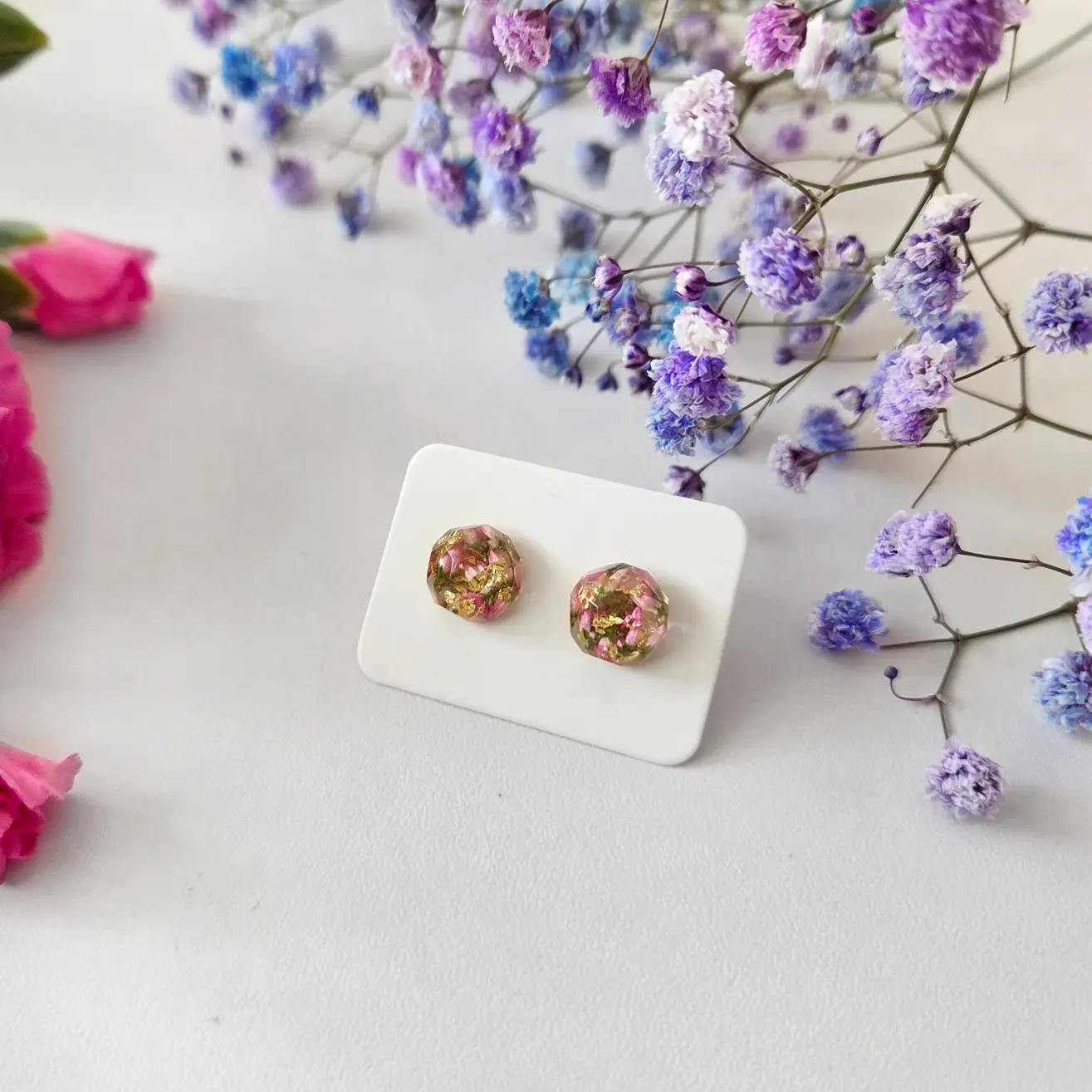 Biżuteria wykonana jest z żywicy epoksydowej polskiego producenta Modelarnia24, własnoręcznie zasuszonych kwiatów oraz wykończona elementami ze stali chirurgicznej (304 i 316L).