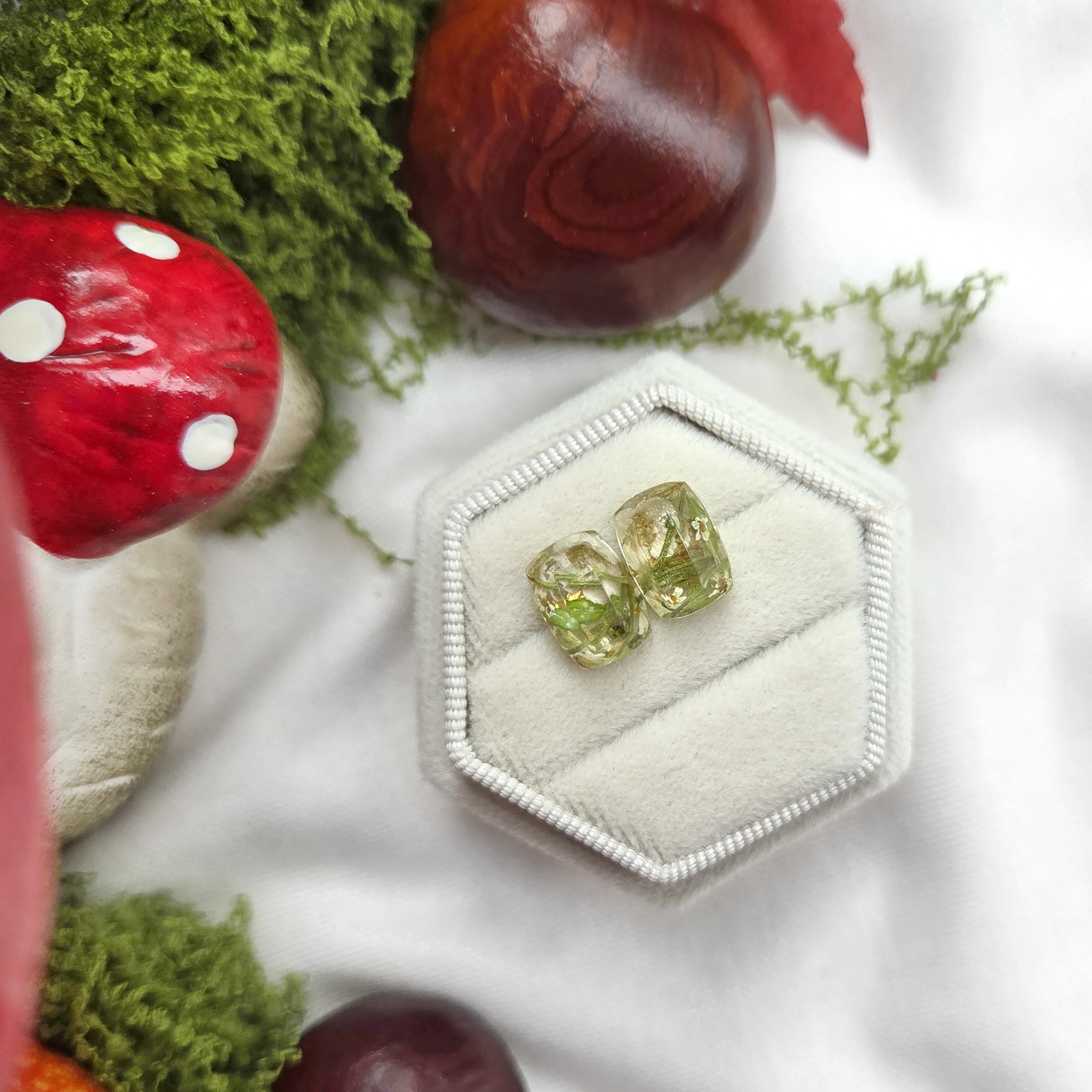 Kolczyki wkrętki z zielonymi roślinkami i smagliczkami zatopionymi w żywicy epoksydowej. Unikatowa biżuteria tworzona ręcznie.