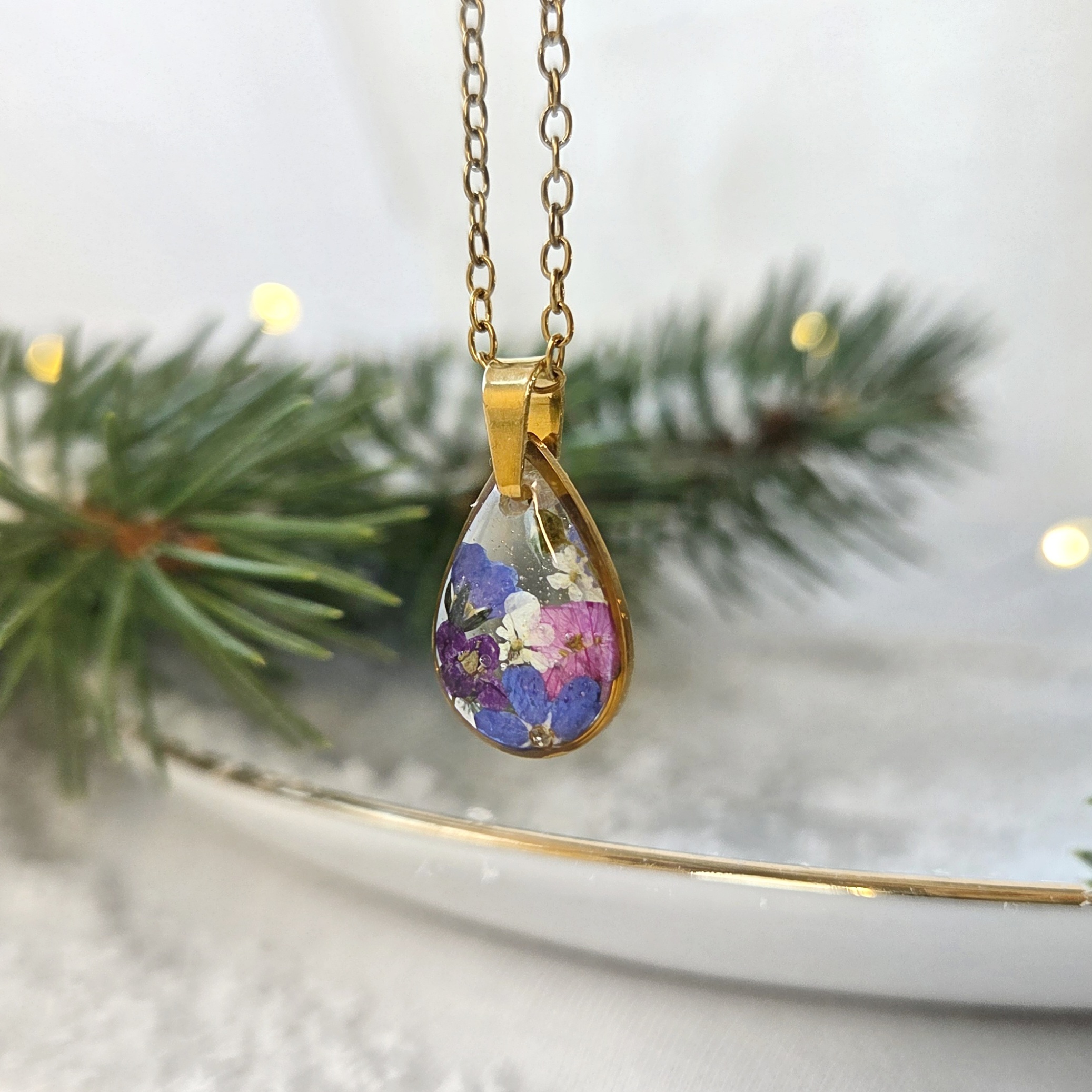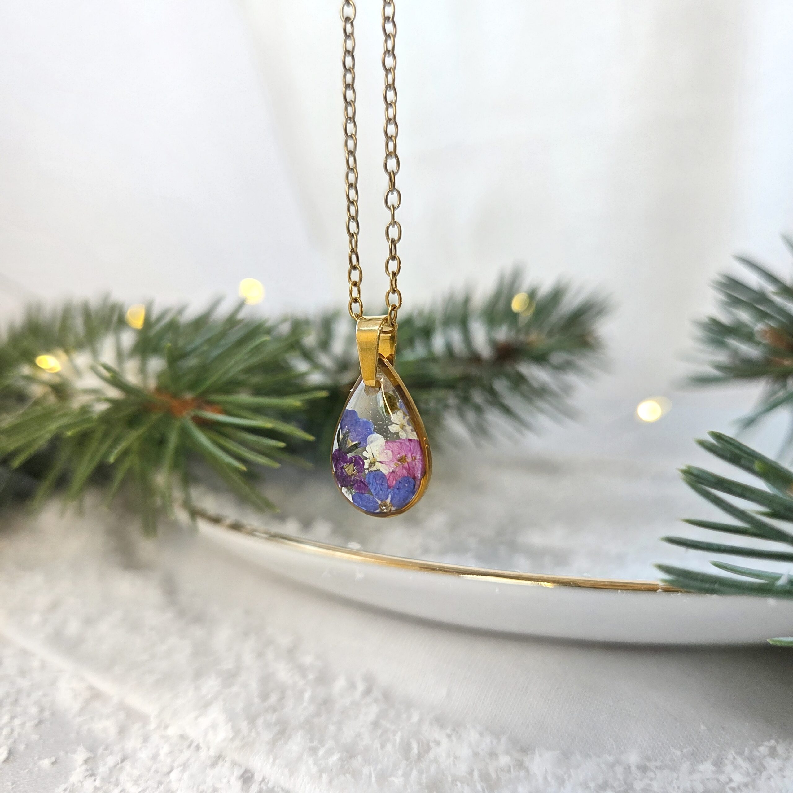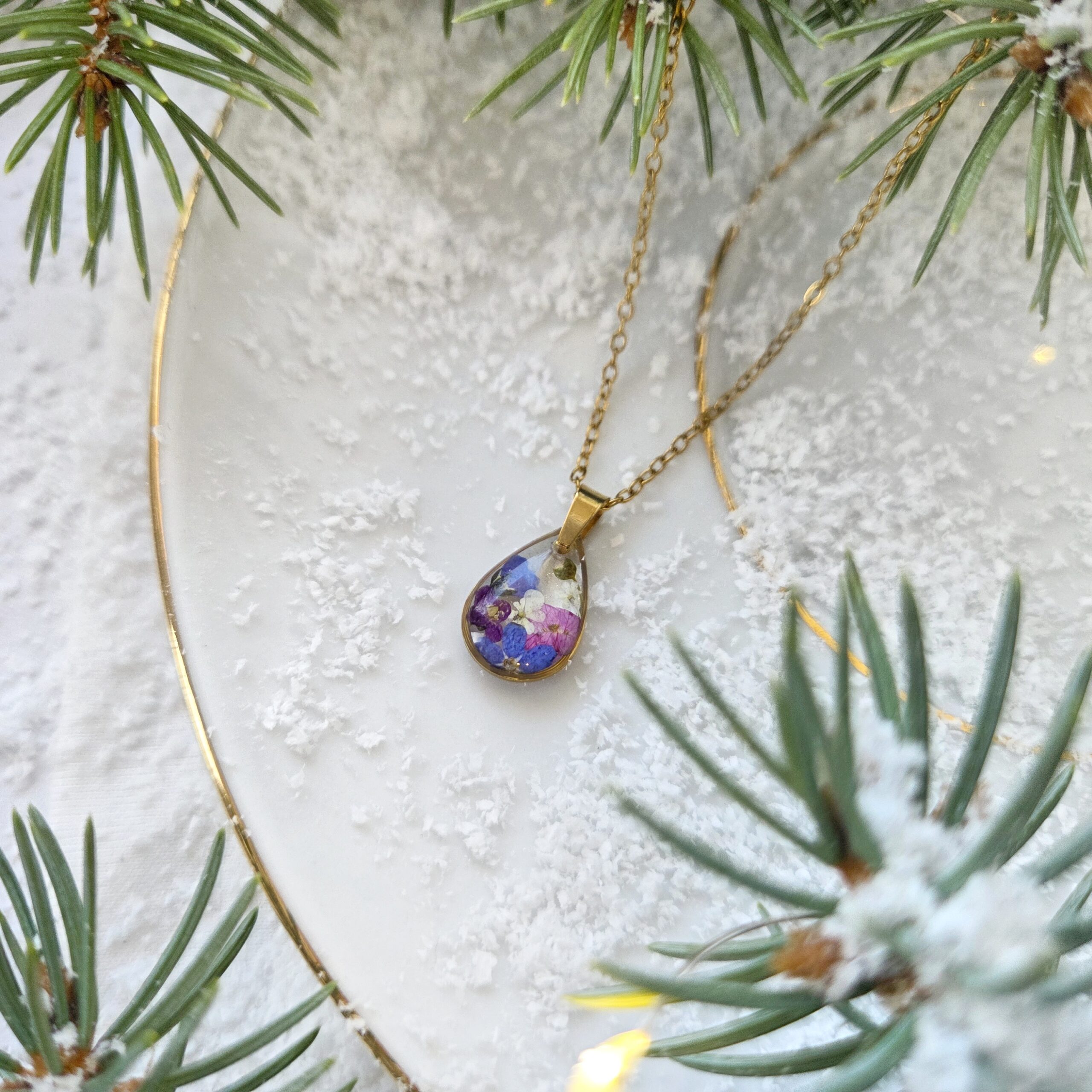 Naszyjnik handmade z kwiatami zatopionymi w żywicy epoksydowej. Delikatny i subtelny naszyjnik ręcznie wykonany.