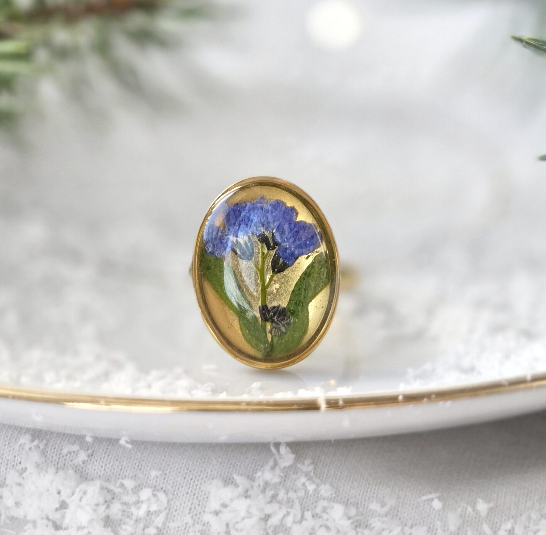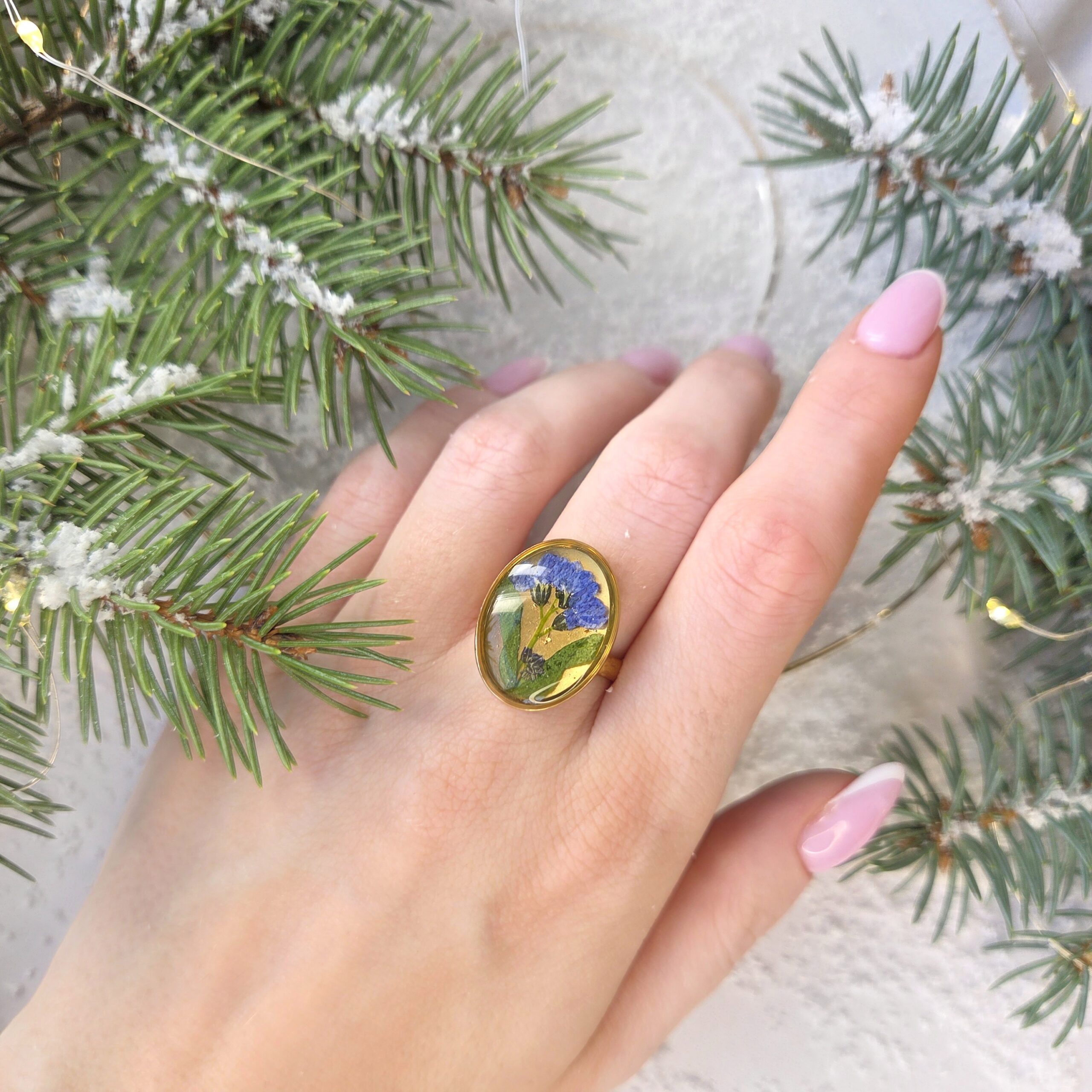 Pierścionek z niezapominajka w stylu vintage. Suszone niezapominajki w żywicy epoksydowej. Pierścionek z dużym oczkiem.